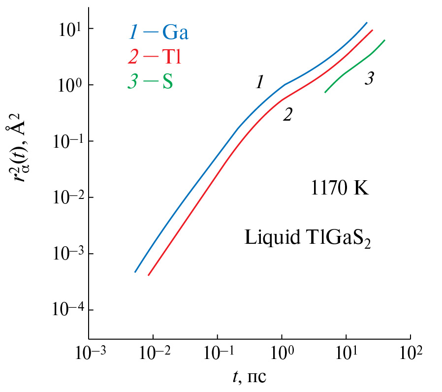 В расчетах предполагалось, что движение атомов системы происходит в так называемом диффузионном режиме и его скорость определяется только диффузией атомов типа α и других атомов TlGaS₂ через слой жидкости. В приближении локальной нейтральности диффузию такого атома можно описать уравнением (2). Результаты расчетов MSD атомов соединения TlGaS₂ в жидком состоянии представлены на рис. 4.