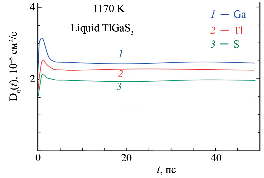 Значения плато зависимости Dα(t) на рис. 5 достигаются через 4 пс. Вычисленные коэффициенты диффузии атомов TlGaS₂ вблизи температуры плавления (1170 К) составляют: , и
