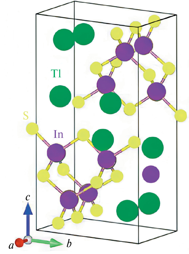 Представленная на рис. 7 элементарная ячейка TlInS₂ моноклинной системы построена на трех векторах a, b и c, имеющих разную длину с двумя прямыми и одним непрямым углами между ними.