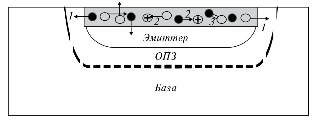 В данной работе рассмотрим только влияние образующихся подпороговых РД на величину тока ∆Igp при следующих допущениях: генерация РД происходит только в эмиттерной области, одномерное приближение, диффузия имеет место только в приповерхностной области. Другими словами, увеличение тока ∆Igp происходит на рекомбинационных центрах в области пространственного заряда (ОПЗ) эмиттерного перехода, которые образуются из-за диффузии первичных РД (возможно и стабильных РД), генерируемых в эмиттерной области (рис. 1).