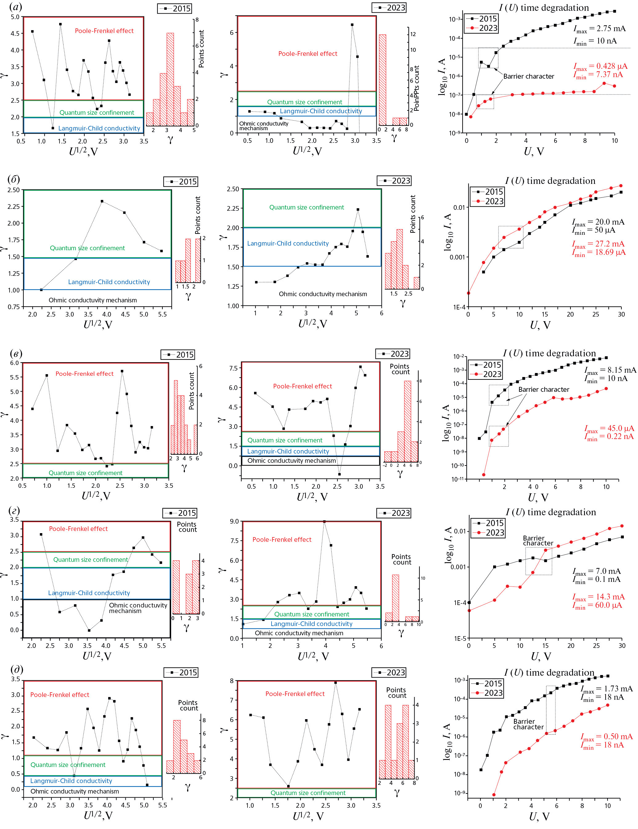 Примечательно то, что временное изменение электрических характеристик для образца № 2 связано с изменением механизма проводимости, которое “перешло” с модели квантового размерного ограничения на модель проводимости Ленгмюра—Чайлда. Характер изменения для образца № 6 проявляется в резком увеличении показателя γ. Причем увеличивается как пиковое значение, так и число точек, попадающих в область, описываемую эффектом Пула—Френкеля. Если в свежеприготовленном образце характер проводимости меняется и носит смешанный тип (эффект Пулла—Френкеля вместе с квантоворазмерным ограничением), то в состаренном образце стабильно прослеживается эффект Пулла—Френкеля.