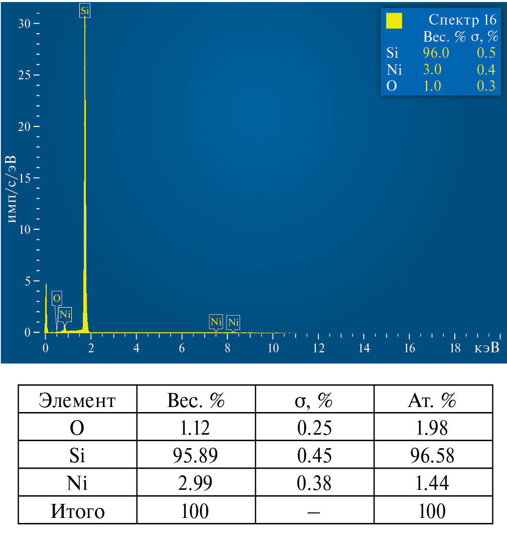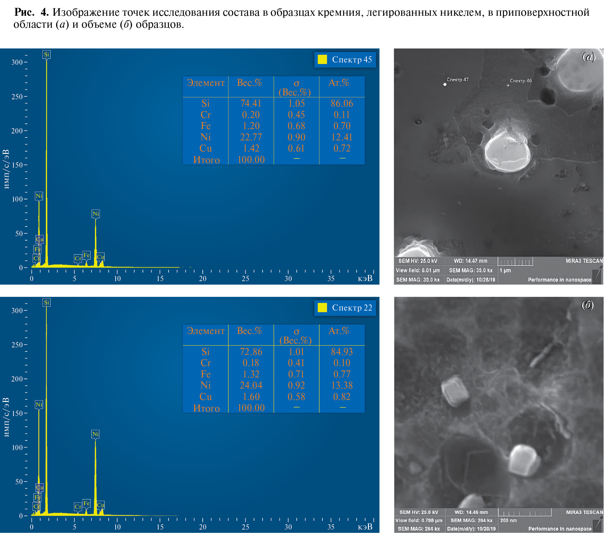 Распределение атомов никеля в приповерхностном слое кремния измерялись с помощью масс-спектрометра CAMECA IMS-6f Magnetic Sector SIMS (SIMS). Элементный состав кластеров никеля как на поверхности, так и на сколе образца исследовался на сканирующем электронном микроскопе марки TESCAN MIRA3 в режиме рентгеновского локального зондового микроанализа. Скол образцов сканировали с шагом 0.5 мкм, начиная от лицевой стороны (сторона, легированная никелем).