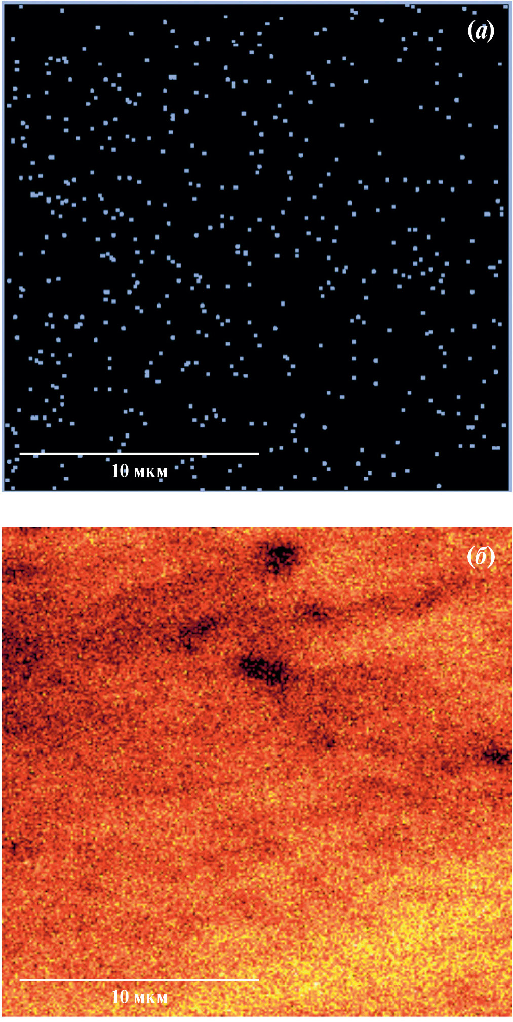 Рис. 3. Снимок поверхности кремния, легированного никелем, полученный методом SIMS для ионов: а — Ni+ (яркие точки соответствуют скоплениям атомов никеля); б — Si+ (яркие точки соответствуют кремнию).