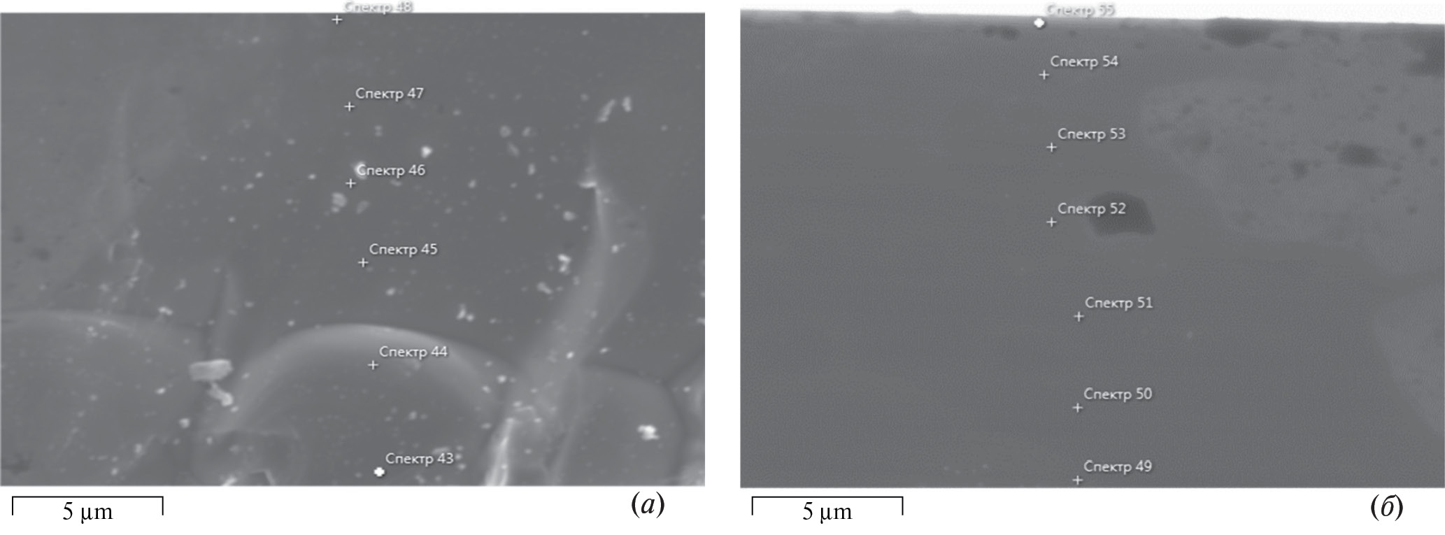 Рис. 4. Изображение точек исследования состава в образцах кремния, легированных никелем, в приповерхностной области (а) и объеме (б) образцов.
