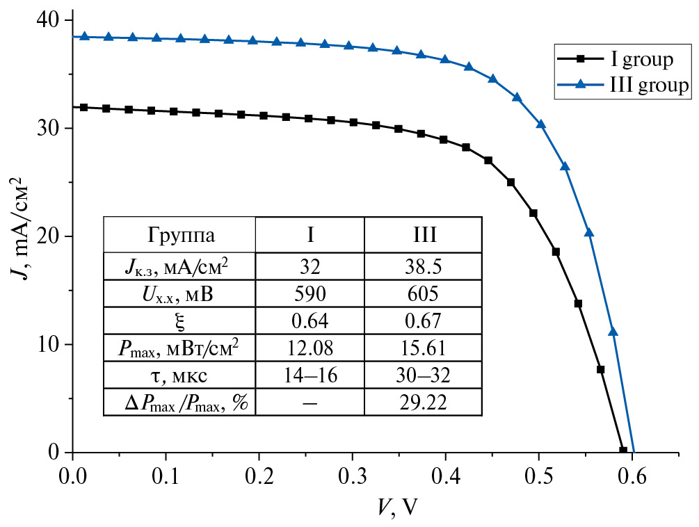 Рис. 6. Вольт-амперные характеристики солнечных элементов и электрофизические параметры (таблица) элементов I и III группы после дополнительного термоотжига при Тотж = 750–800C (ΔРmах / Рmах — относительное изменение максимальной мощности по сравнению с контрольными образцами).