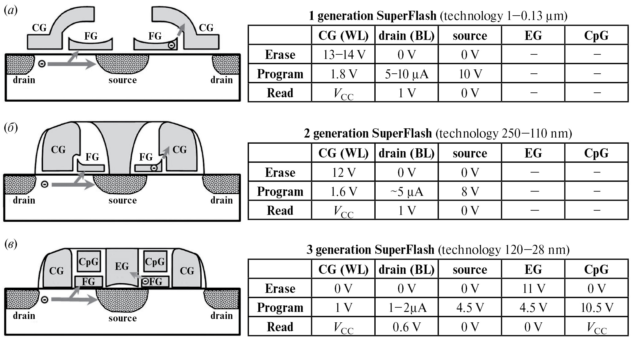 Рис. 1. Схемы вертикальных сечений ЯП SuperFlash 1-го (а), 2-го (б) и 3-го (в) поколений с таблицами режимов работы [6—10].