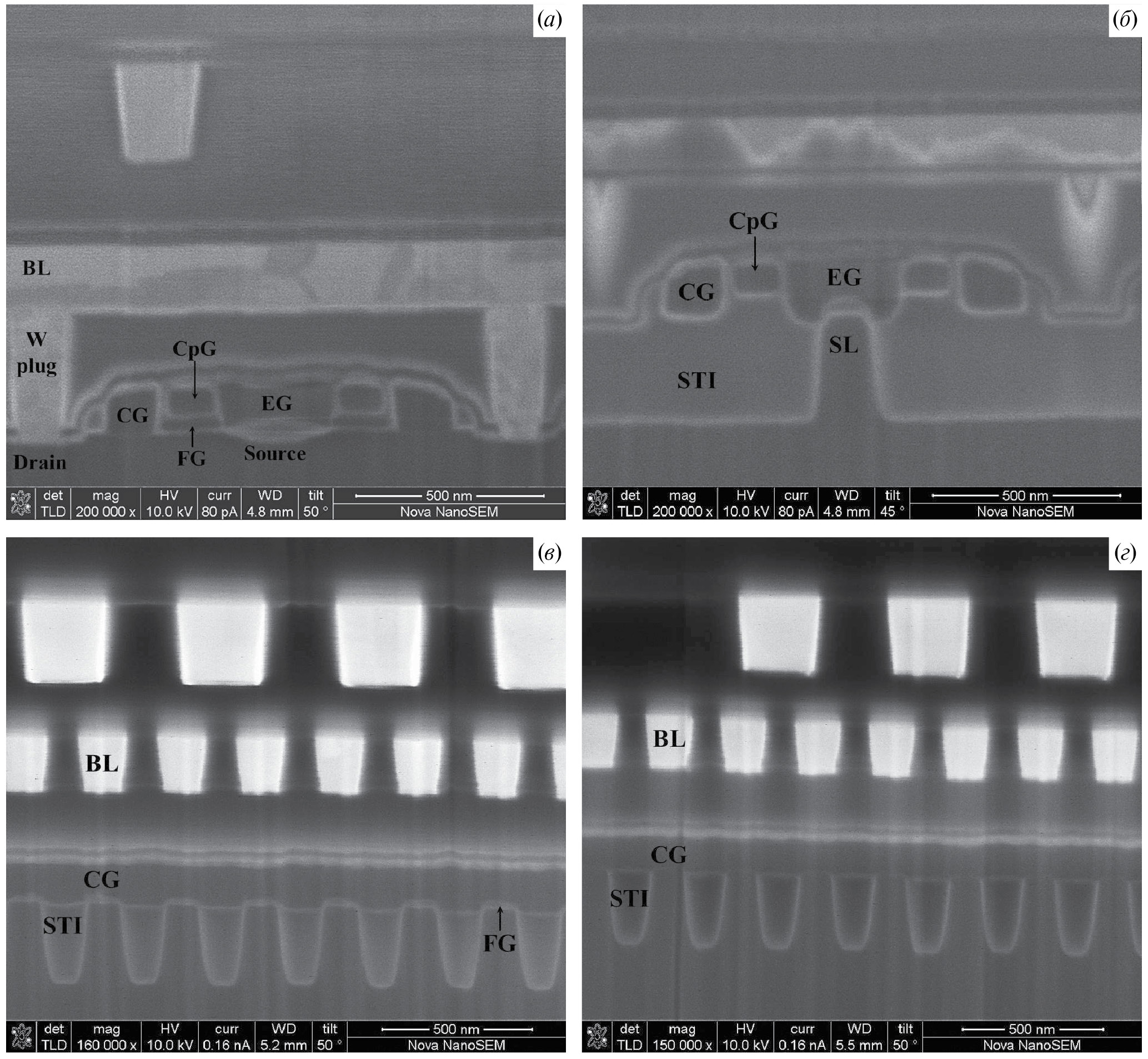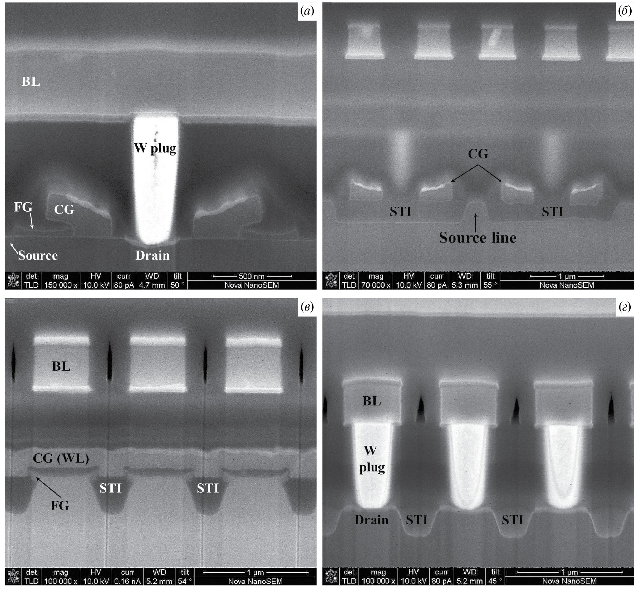 Рис. 8. РЭМ-изображения вертикальных сечений транзисторов памяти SF 3-го поколения вдоль БЛ (а, б) и СЛ (в, г).