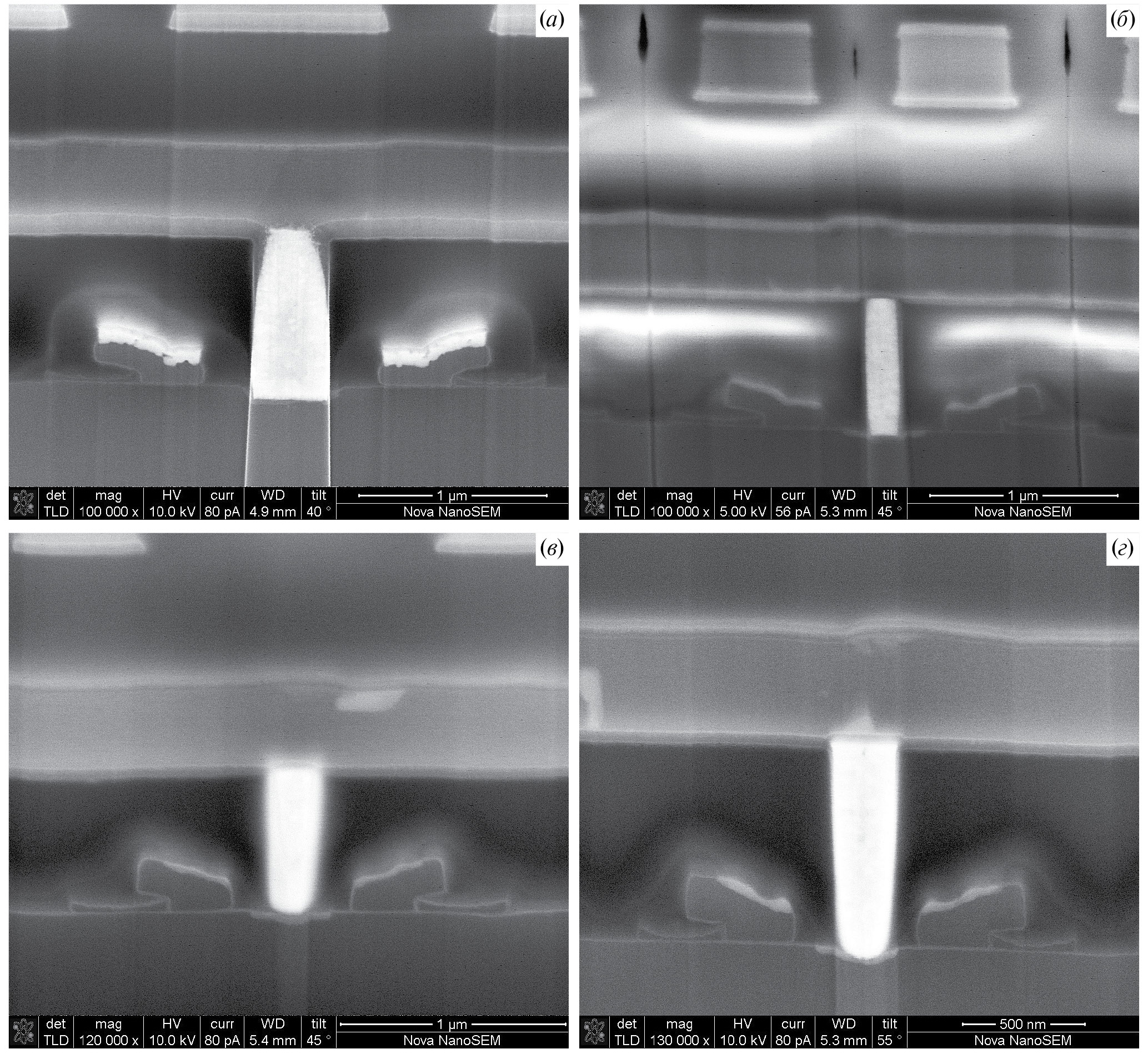 Рис. 5. РЭМ-изображения вертикальных сечений транзисторов памяти SF 1-го поколения вдоль БЛ (а, б) и СЛ (в, г).