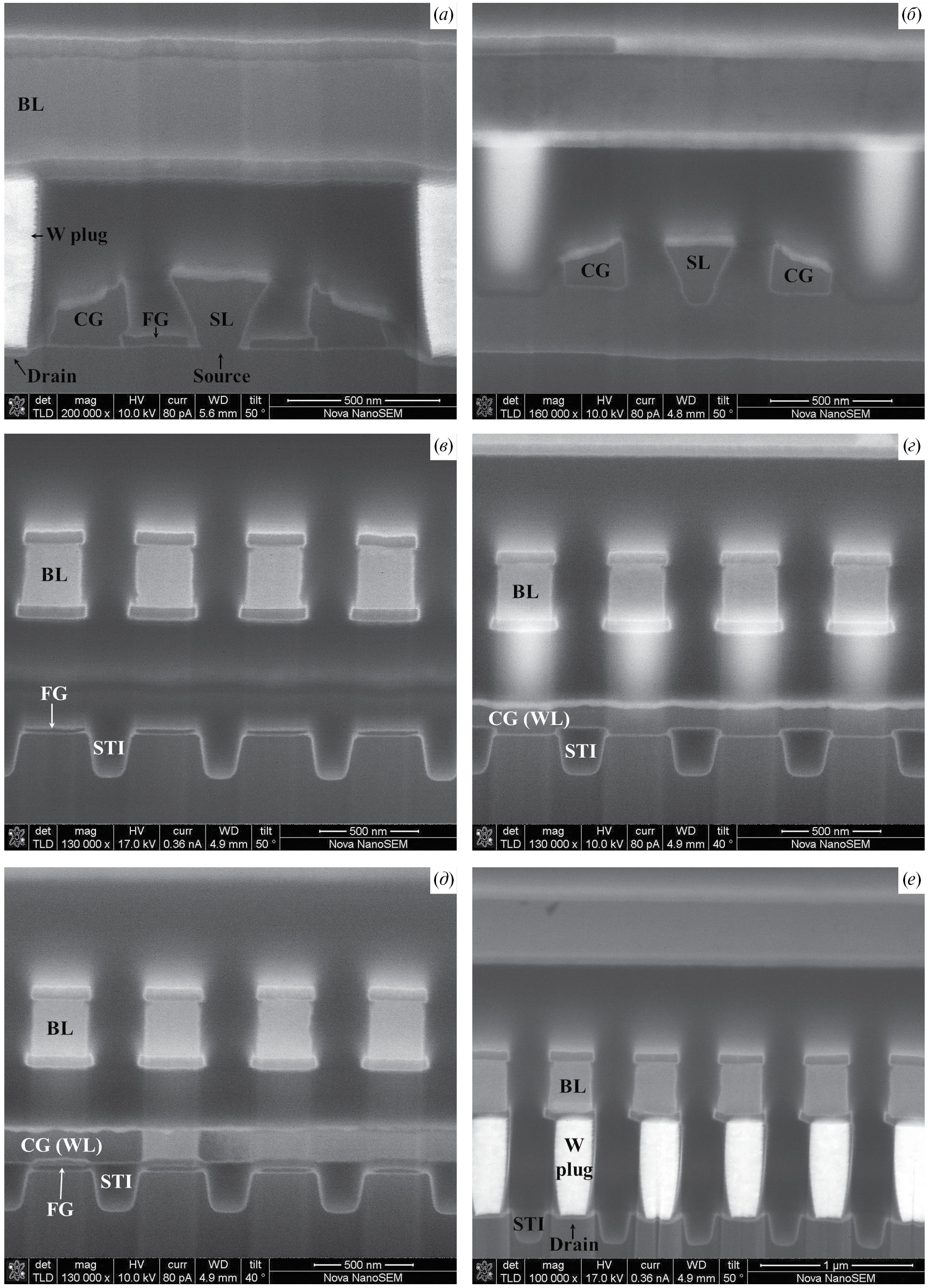 Рис. 7. РЭМ-изображения вертикальных сечений транзисторов памяти SF 2-го поколения вдоль БЛ (а, б) и СЛ (в—е).