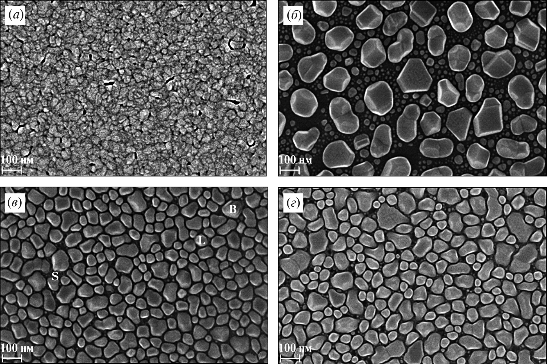 Рис. 1. SEM изображения поверхности магнетронных пленок Al со средней толщиной 20–50 нм, сформированных при стационарном режиме на подложке Si(111) при температуре: 20 (a), 200 (б), 400 (в) и 500°C (г). Буквами B, L и S (в) отмечены кристаллиты с характерными размерами