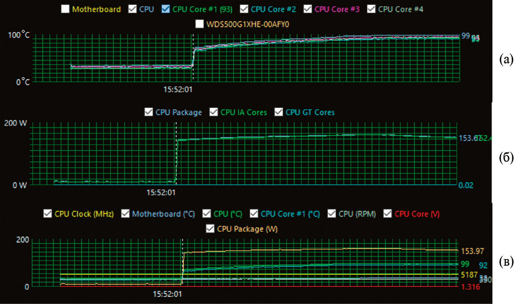 Рис. 1. Изменение температуры основных компонентов и ядер процессора (а), мощности процессора (б) и частоты (в) от времени
