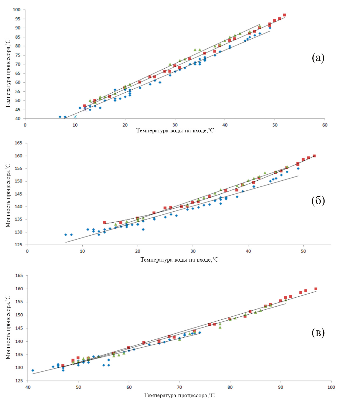 Рис. 4. Зависимость температуры процессора от: температуры входящей в водоблок воды – а) , мощности процессора от температуры входящей в водоблок воды – б), мощности процессора от температуры процессора – в) при расходах 0.3 л/мин (∆), 0.55 л/мин (□), 1 л/мин (°).