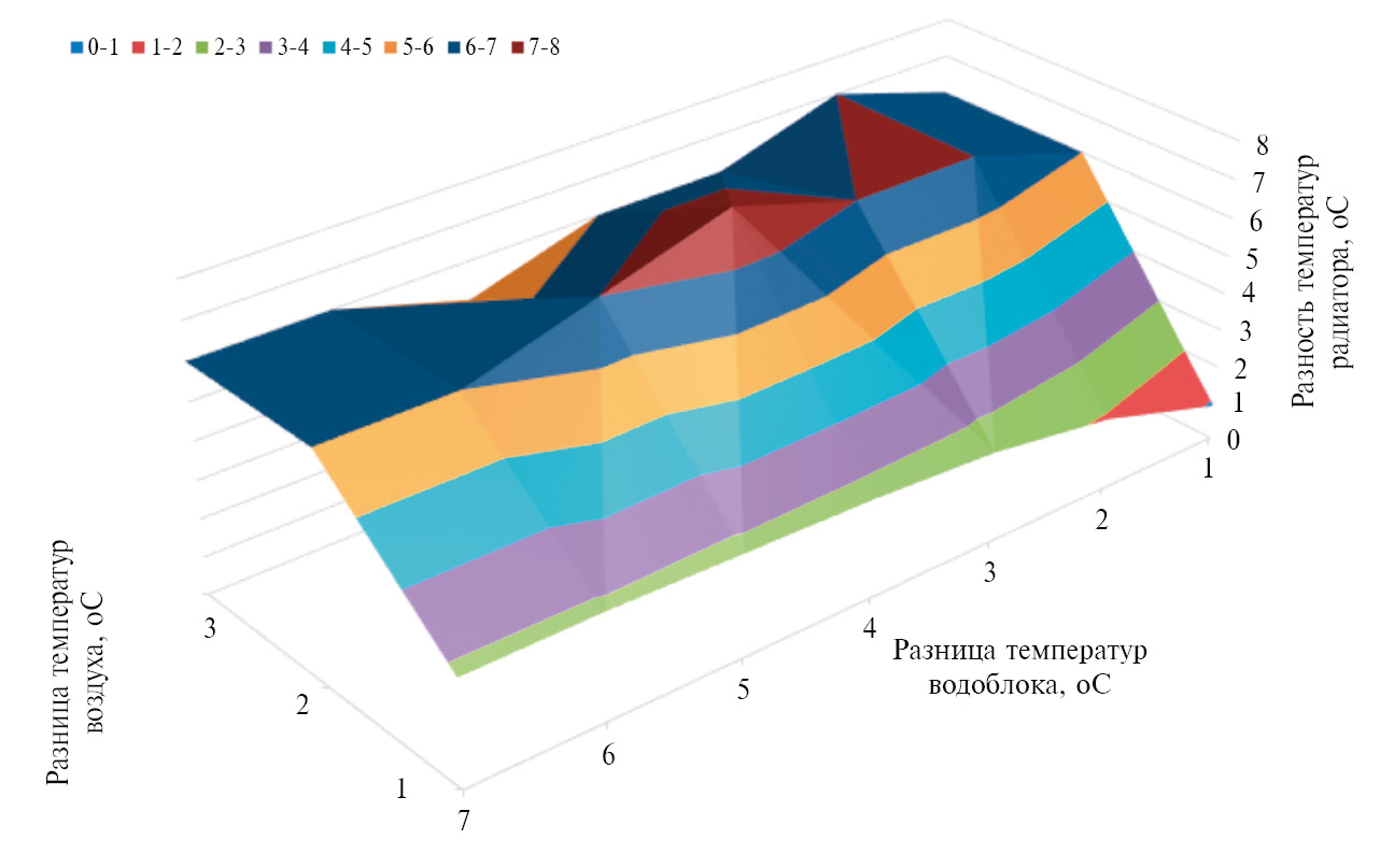 Рассматривая разности температур на входе и выходе каждого из основных элементов, построен трёхмерный график, связывающий динамику основных элементов системы охлаждения (рис. 5).
