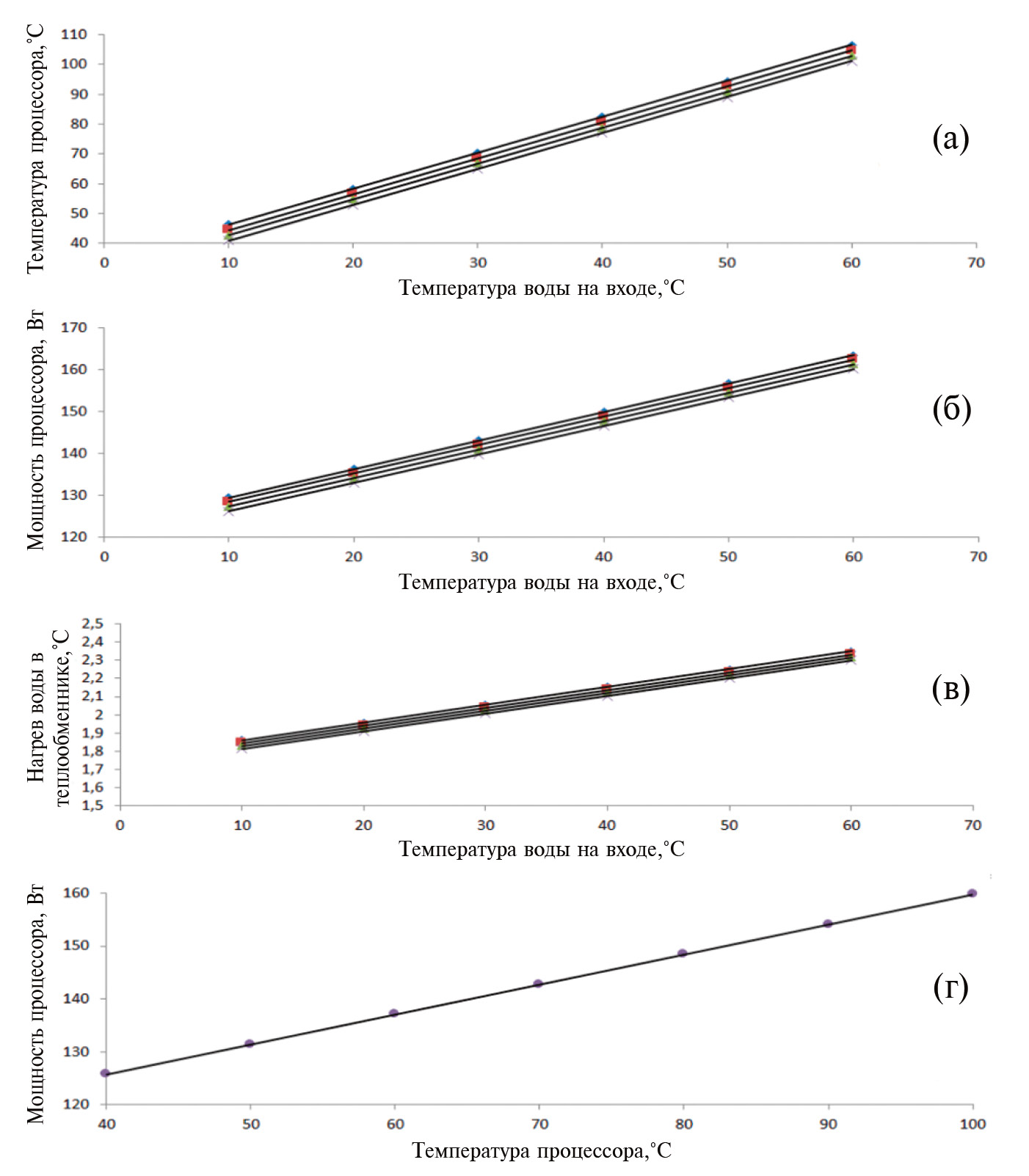 Рис. 6. Зависимость температуры процессора от температуры входящей в водоблок воды – а), мощности процессора от температуры входящей в водоблок воды – б), нагрева воды от температуры входящей в водоблок воды – в), мощности процессора от температуры процессора – г), при расходах 0.3 л/мин (∆), 0.55 л/мин (□), 1 л/мин (°), 1.2 л/мин (×).