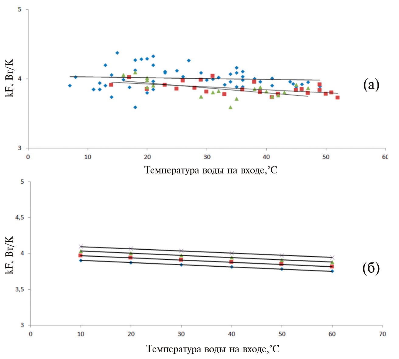 Рис. 7. Зависимость характеристики теплообменника процессора от температуры воды по экспериментальным данным а), по данным из математической модели б) при расходе – 0.3 л/мин (◊), 0.6 л/мин (□). 0.9 л/мин (∆), 1.2 л/мин (×).