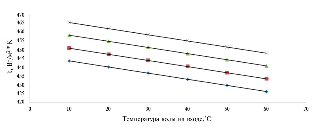 Рис. 8. Расчётная зависимость коэффициенте теплопередачи от температуры воды при расходе – 0.3 л/мин (◊), 0.6 л/мин (□). 0.9 л/миг (∆), 1.2 л/мин (×).