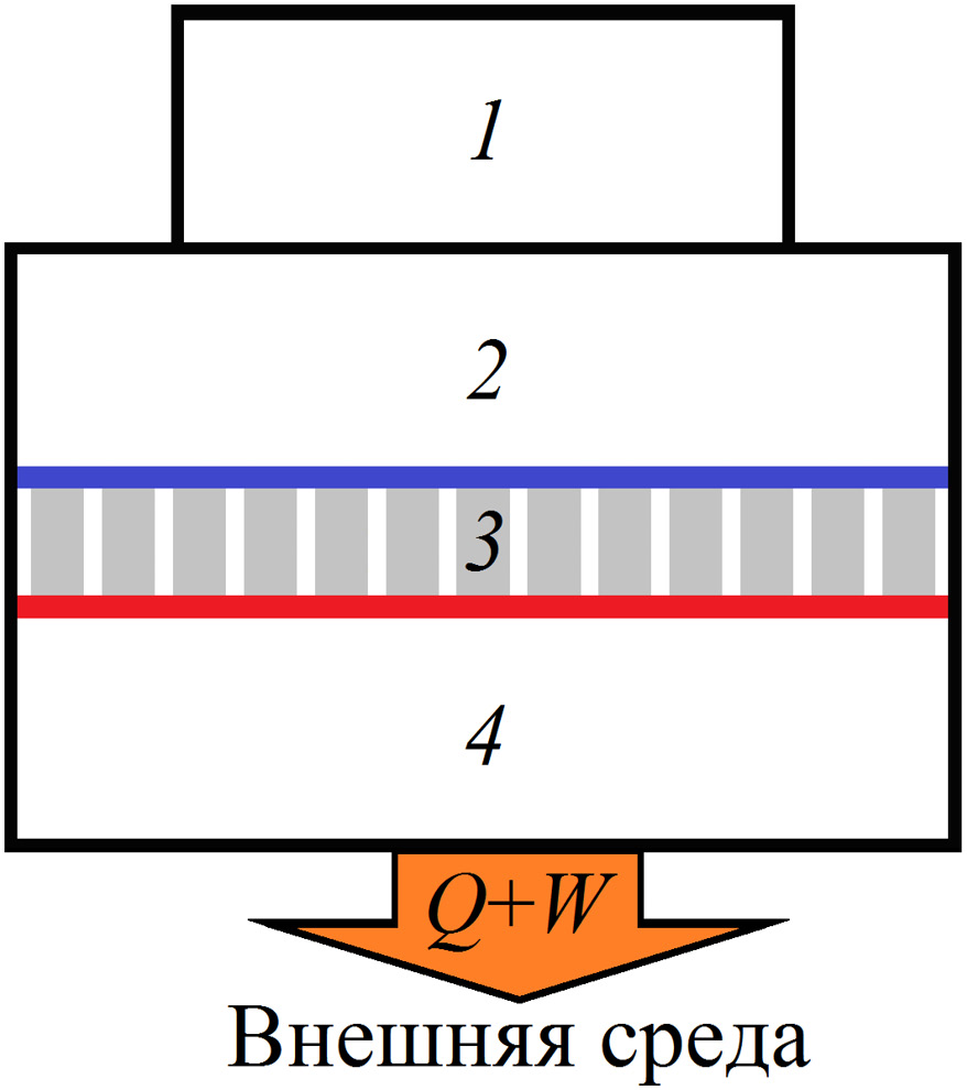 Рис. 1. Схема термоэлектрической системы охлаждения и терморегулирования: 1 — теплонагруженный элемент, 2 — теплораспределитель, 3 — термоэлектрический модуль, 4 — устройство отвода теплоты.