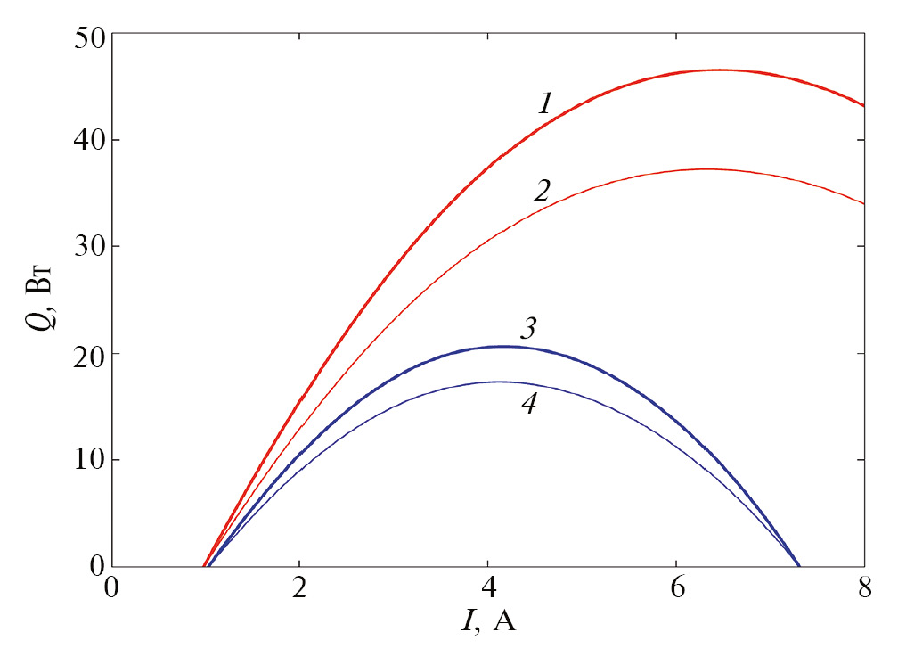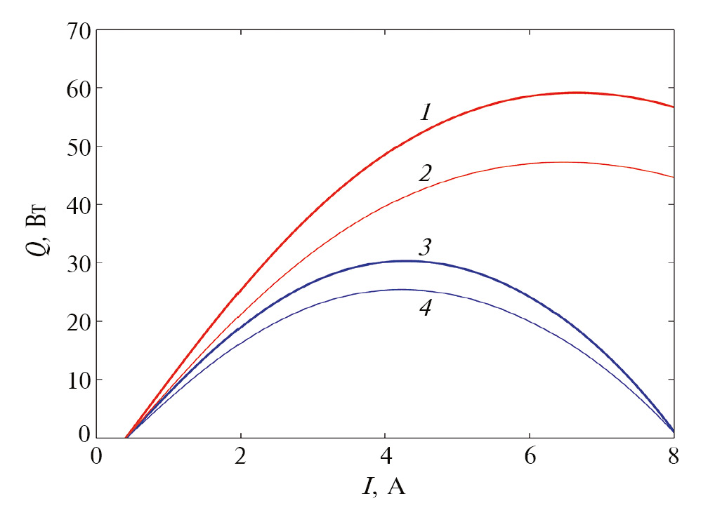 Величина холодопроизводительности численно равна тепловой мощности, которая будет отведена от теплонагруженного элемента при заданных параметрах системы охлаждения. Зависимость холодопроизводительности Q(I) для ΔT0 = –10 оС приведена на рис. 2 для следующих значений термических сопротивлений: 1 – RТ = 0.1 К/Вт, RS = 0.1 К/Вт, 2 – RТ = 0.3 К/Вт, RS = 0.1 К/Вт, 3 – RТ = 0.1 К/Вт, RS = 0.3 К/Вт, 4 – RТ = 0.3 К/Вт, RS = 0.3 К/Вт. Представленные зависимости Q(I) имеют максимумы, величина которых зависит от термических сопротивлений. Из сравнения графиков видно более существенное влияние изменения величины RS, это обусловлено тем, что через устройство теплоотвода во внешнюю среду помимо теплоты от теплонагруженного элемента дополнительно передается собственное тепловыделение ТЭМ. Значения силы тока, при которых достигаются максимумы Q, также в большей степени зависят от термического сопротивления RS. Значениям Q, которые ниже максимальных, соответствуют по два значения силы тока, более эффективный режим работы обеспечивается при меньшем значении силы тока, поскольку в этом случае собственное энергопотребление ТЭМ ниже.