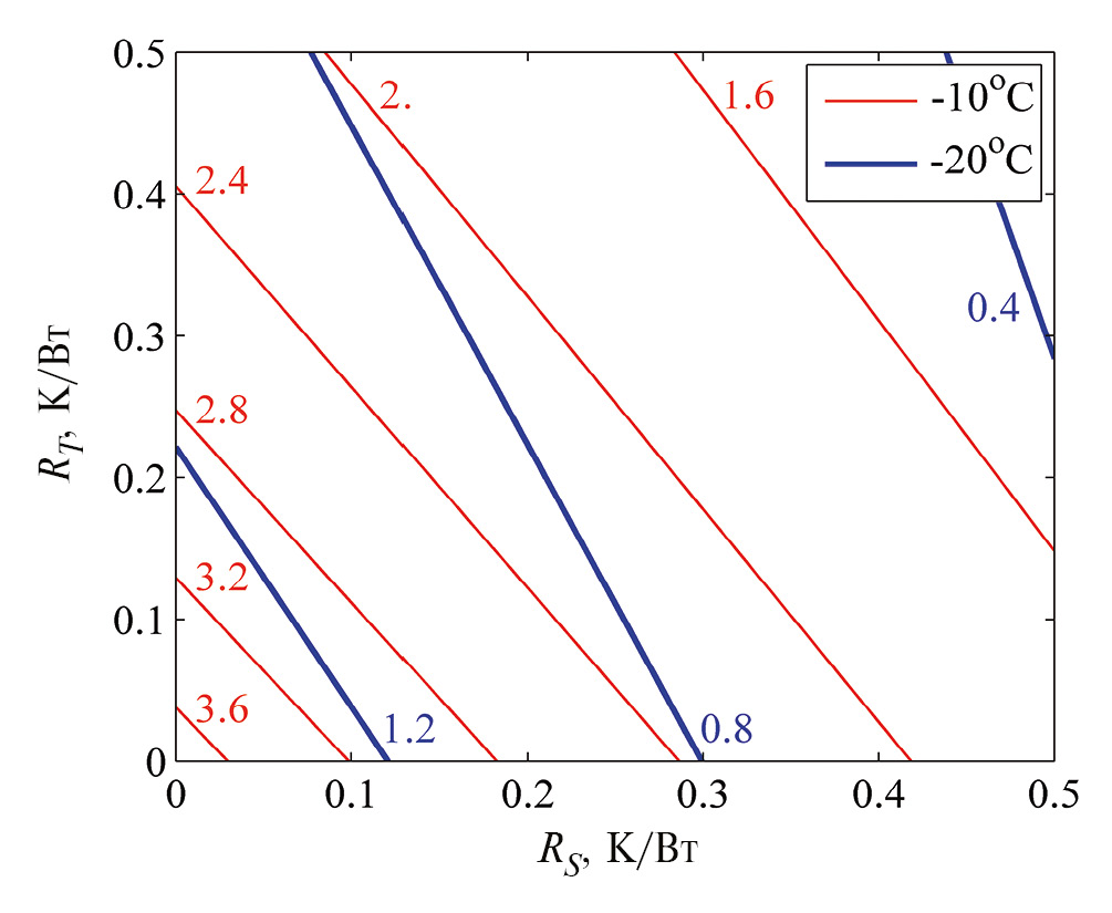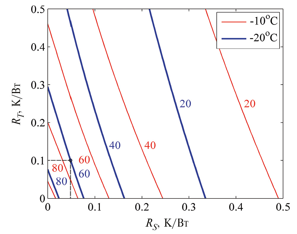 Результаты расчетов холодопроизводительности для значений ΔT = –10 оС и –20 оС приведены на плоскости RS – RТ в виде изолиний, на которых указаны соответствующие им значения Qmax в Ваттах (рис. 4). Данная диаграмма дает общую картину зависимости максимальной холодопроизводительности от термических сопротивлений термоэлектрической системы охлаждения и позволяет оценивать величины RS и RТ, при которых обеспечивается заданный температурный режим теплонагруженного элемента с известной мощностью тепловыделения. Так, например, для ΔT0 = –20 оС значение Q = 60 Вт может быть достигнуто при RТ = 0.1 К/Вт и RS ≈ 0.05 К/Вт, эти значения отмечены на рисунке штриховыми линиями, а место пересечения на изолинии выделено кружком. При этом каждой точке на изолинии соответствует своя согласованная пара значений RS и RТ. В то же время холодопроизводительность 60 Вт не может быть получена при RS > 0.08 К/Вт для ΔT0 = –20 оС и RS > 0.13 К/Вт для ΔT0 = –10 оС. Термическое сопротивление теплораспределителя в меньшей степени ограничивает величину холодопроизводительности, величина Q = 60 Вт не может быть получена при RT > 0.29 К/Вт для ΔT0 = –20 оС и RT > 0.46 К/Вт для ΔT0 = –10 оС. Более сильное ограничивающее влияние величины RS на холодопроизводительность объясняется увеличенным перепадом температуры в устройстве теплоотвода при отводе суммарной тепловой мощности Q + W. Из проведенного анализа следует, что представленная диаграмма позволяет определить диапазоны значений RS и RT, при которых достигается заданная холодопроизводительность термоэлектрической системы охлаждения. Определение силы тока, обеспечивающей заданную холодопроизводительность, производится с помощью зависимостей Q(I) (рис. 2).
