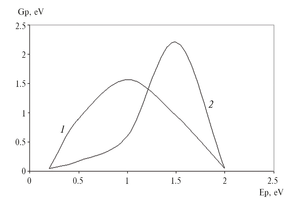 Рис. 2. Распределения энергий активации связи Si-H в начале каждой фазы для постоянного напряжения Uds, где 1 – в начале первого цикла восстановления (усеченный гаусс), 2 – в начале четвертого цикла.