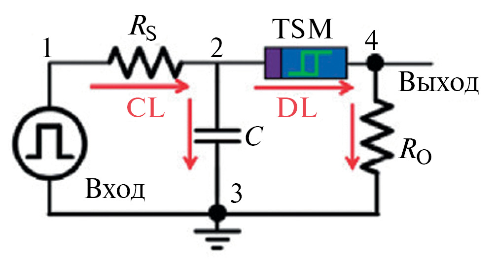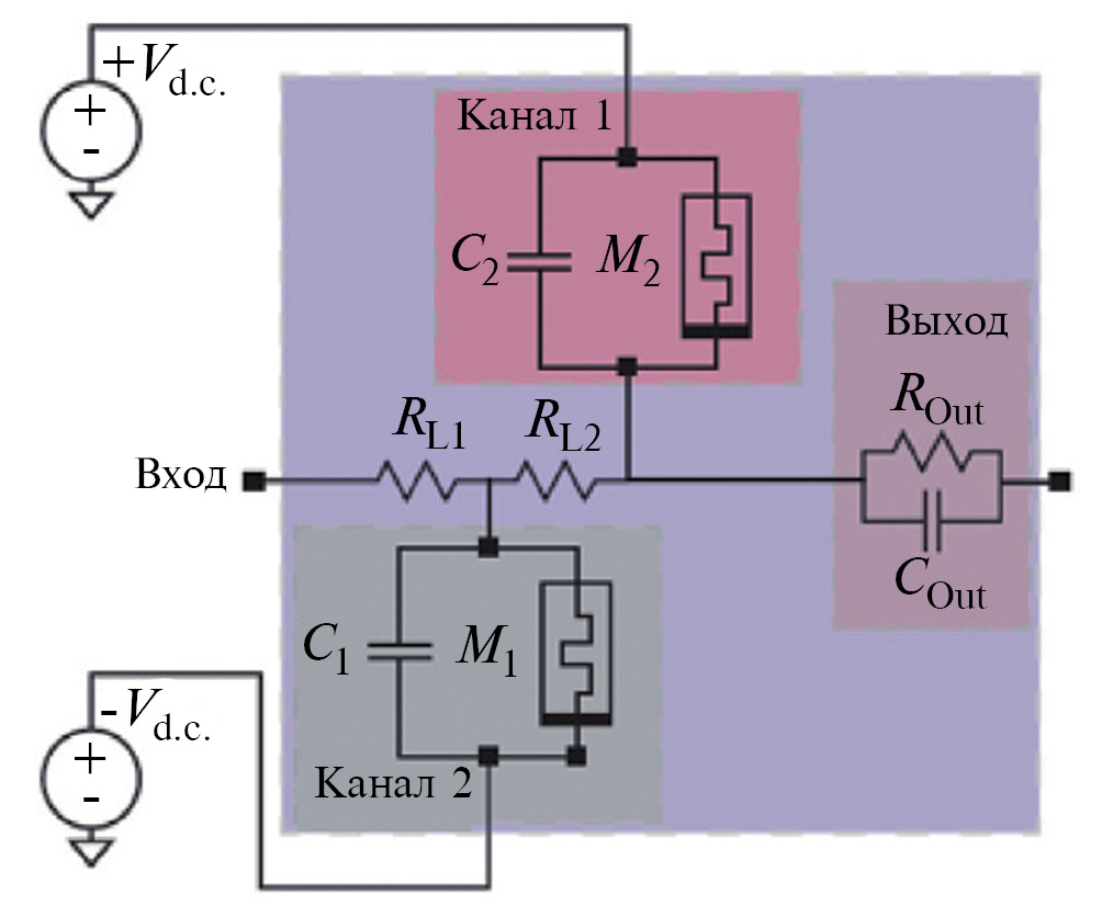 Рис. 4. Схема нейристора, построенного с использованием двух наноразмерных мемристоров в соответствии с моделью Ходжкина—Хаксли [69].