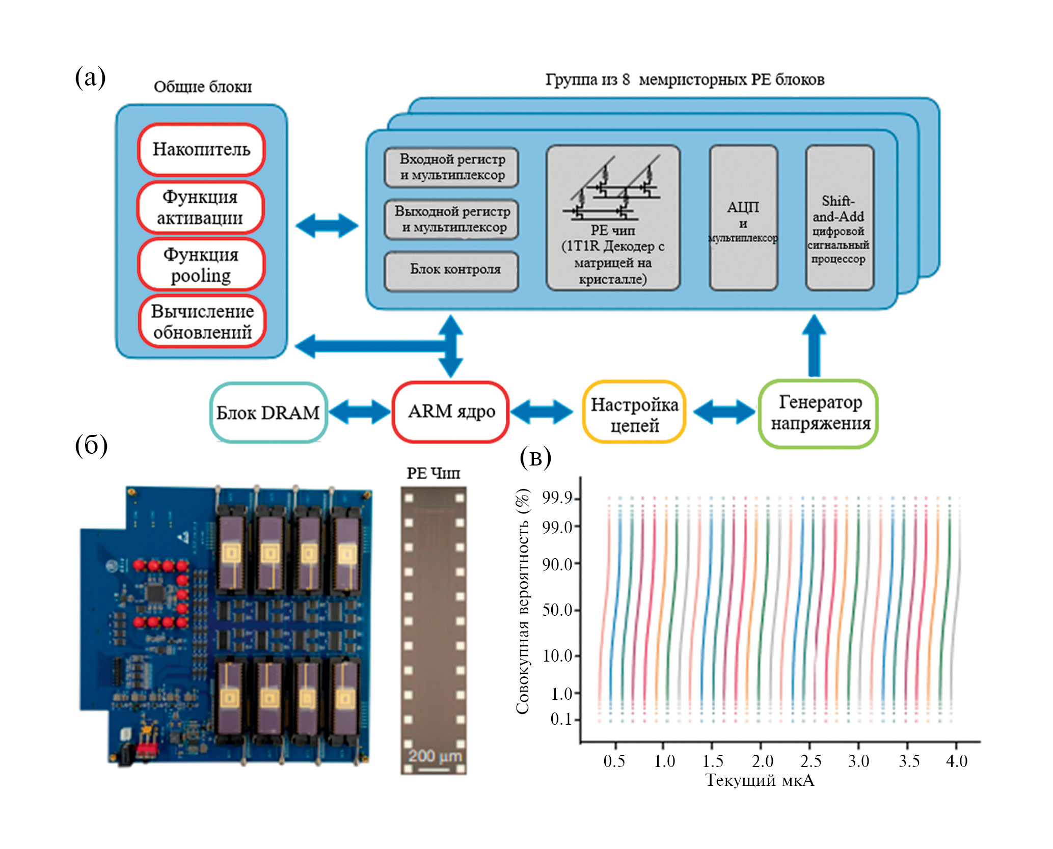 Была предложена универсальная вычислительная архитектура нейронных сетей на основе мемристоров, показанная на рис. 6. Мемристорная ячейка использует стек материалов TiN/TaOx/HfOx/TiN [51] и демонстрирует способность к непрерывной настройке проводимости как при потенцировании (SET), так и при депрессии (RESET) путем модуляции электрического поля и тепла [77]. Была создана аппаратная система с несколькими мемисторными матрицами с использованием специализированной печатной платы (PCB) и оценочной платы программируемой вентильной матрицы (ZC706, Xilinx).