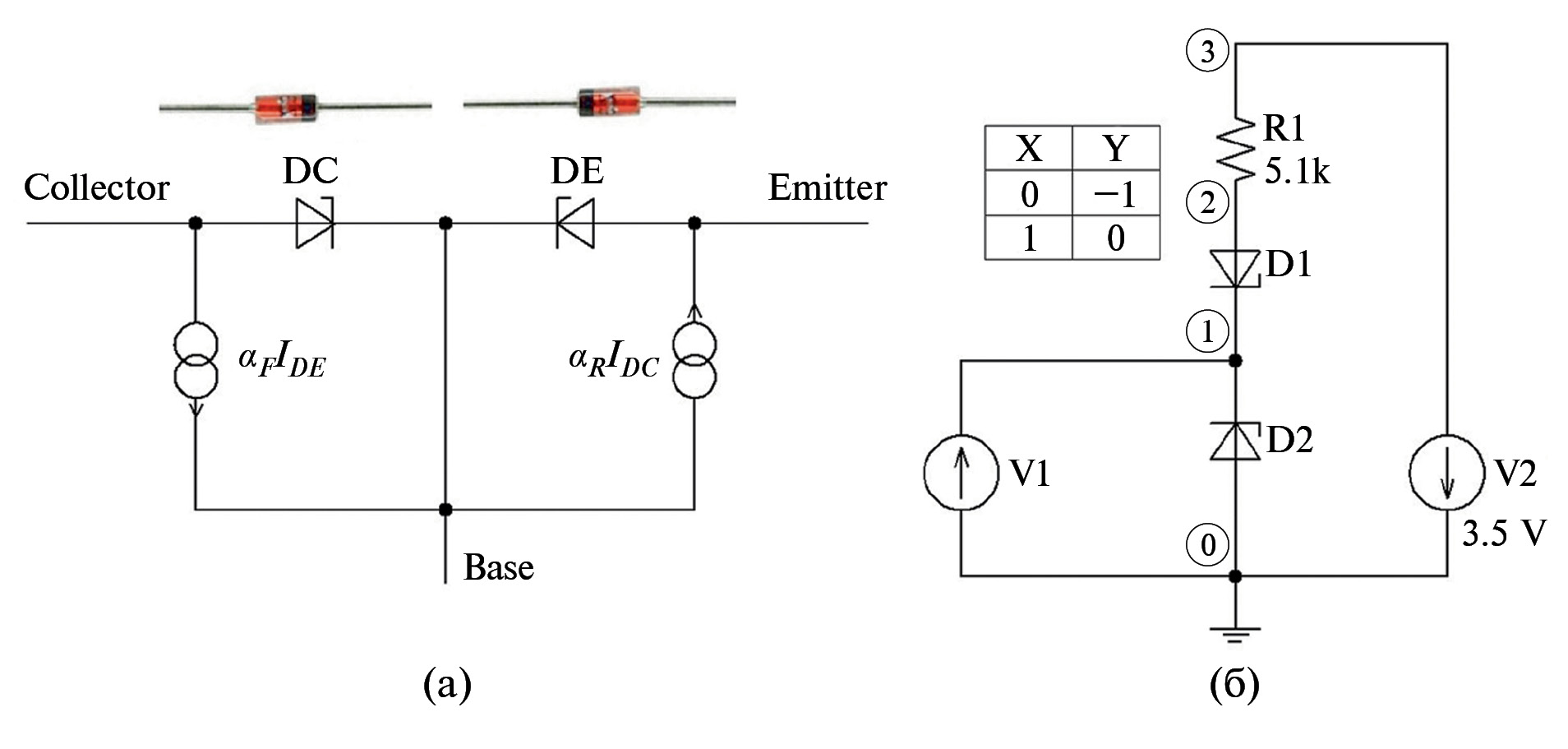 Симметричный относительно базы биполярный транзистор с туннельным пробоем коллекторного и/или эмиттерного p-n-переходов представляется в виде двух одинаковых диодов стабилитронов, включенных навстречу друг другу. Аналог инжекционной модели Эберса–Молла прибора изображен на рис. 1а. Были выбраны диоды с номинальным пробивным напряжением 3 В, из которых строили действующий макет транзистора. Исследовали статические и динамические характеристики схемы на рис. 1б, а также ВАХ отдельных диодов. Полученные характеристики показаны на рис. 2, 3. В экспериментах использовали приборы Rigol MSO1074, Rigol DG1062 и DT9208A; схемотехническое моделирование проводили с помощью программы TINA-TI [5]. Ниже приведен пример задания на моделирование схемы на рис. 1б в формате SPICE.