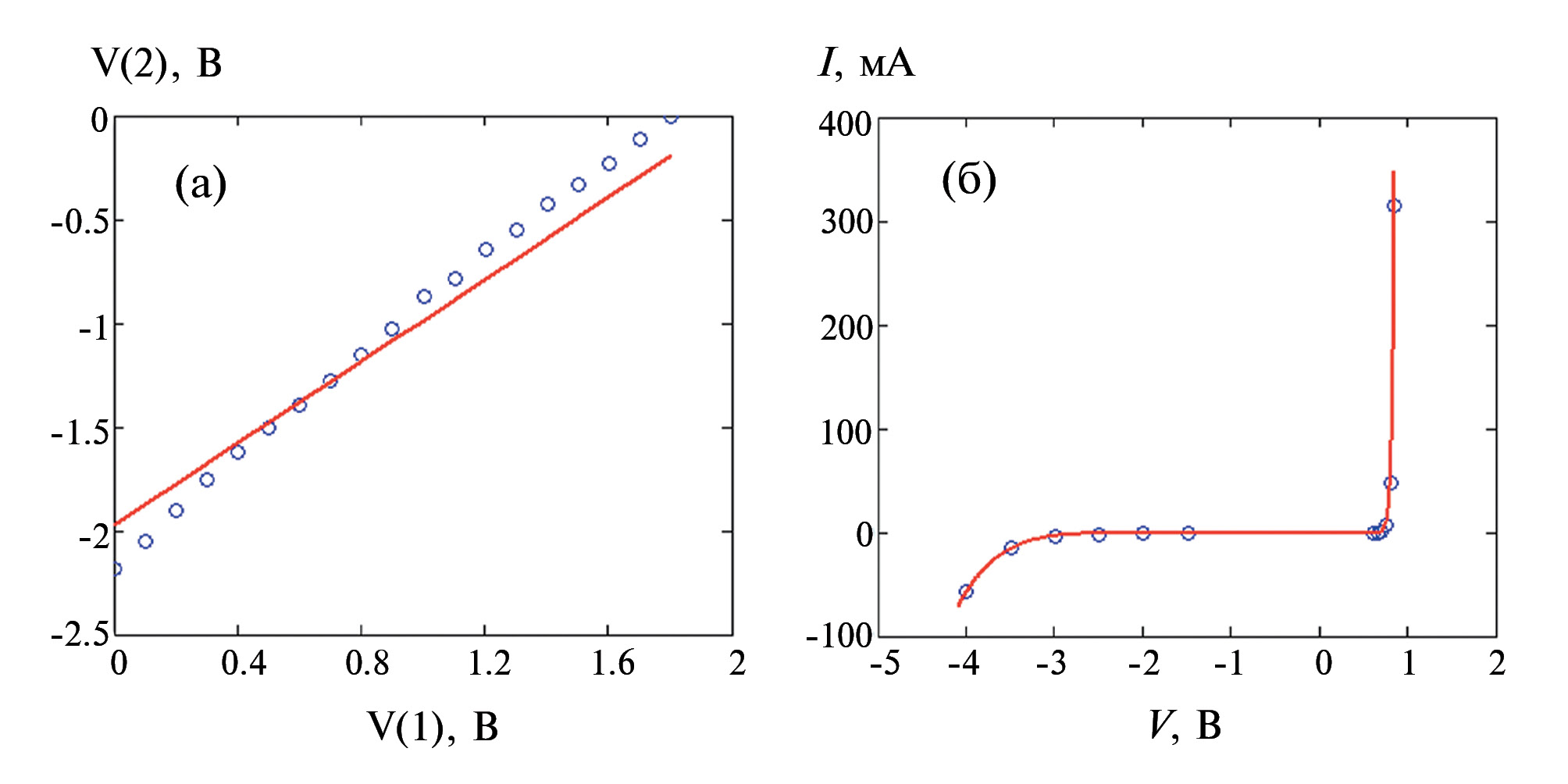 Рис. 2. Передаточная характеристика по напряжению схемы на рис. 1б (а) и ВАХ диода (б): кружки — экспериментальные данные; сплошные линии — расчеты по SPICE-модели и формуле (1).