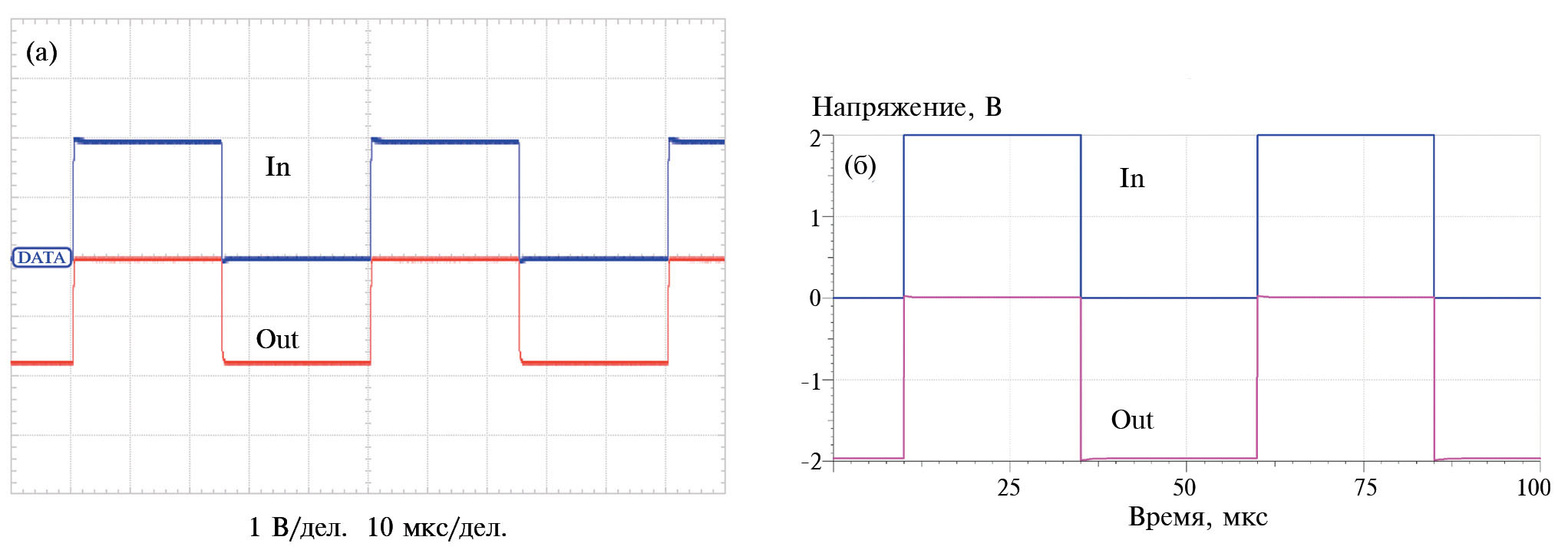 Рис. 3. Осциллограммы сигналов схемы на рис. 1б: (а) — эксперимент; (б) — SPICE-моделирование.
