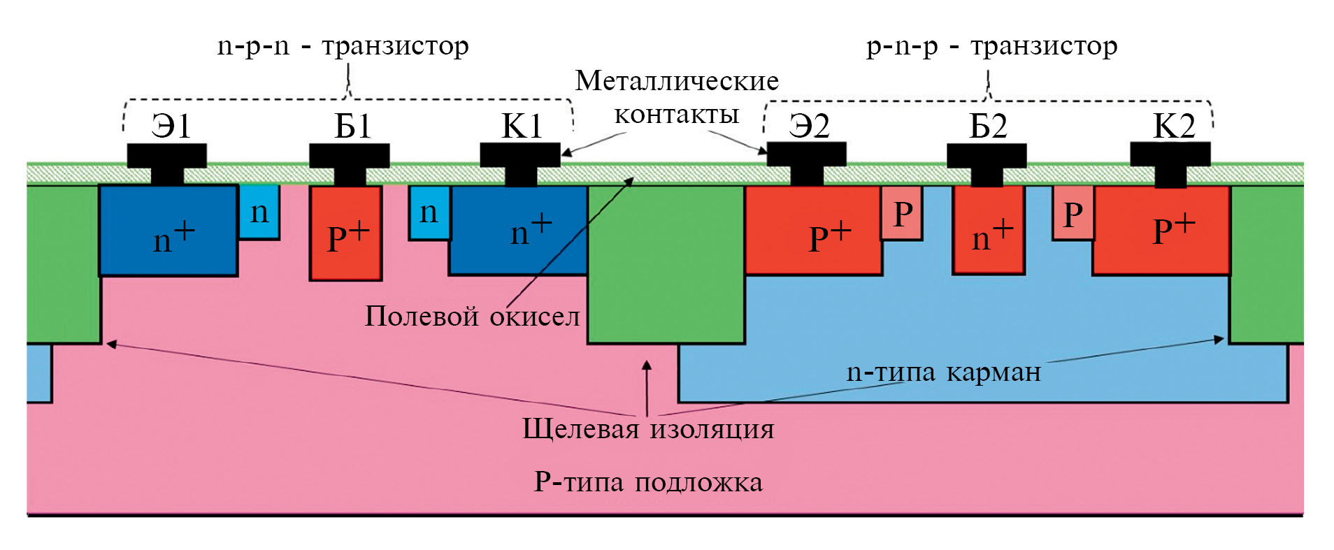 Рис. 4. Типовая структура совмещенных биполярных транзисторов с туннельным пробоем.