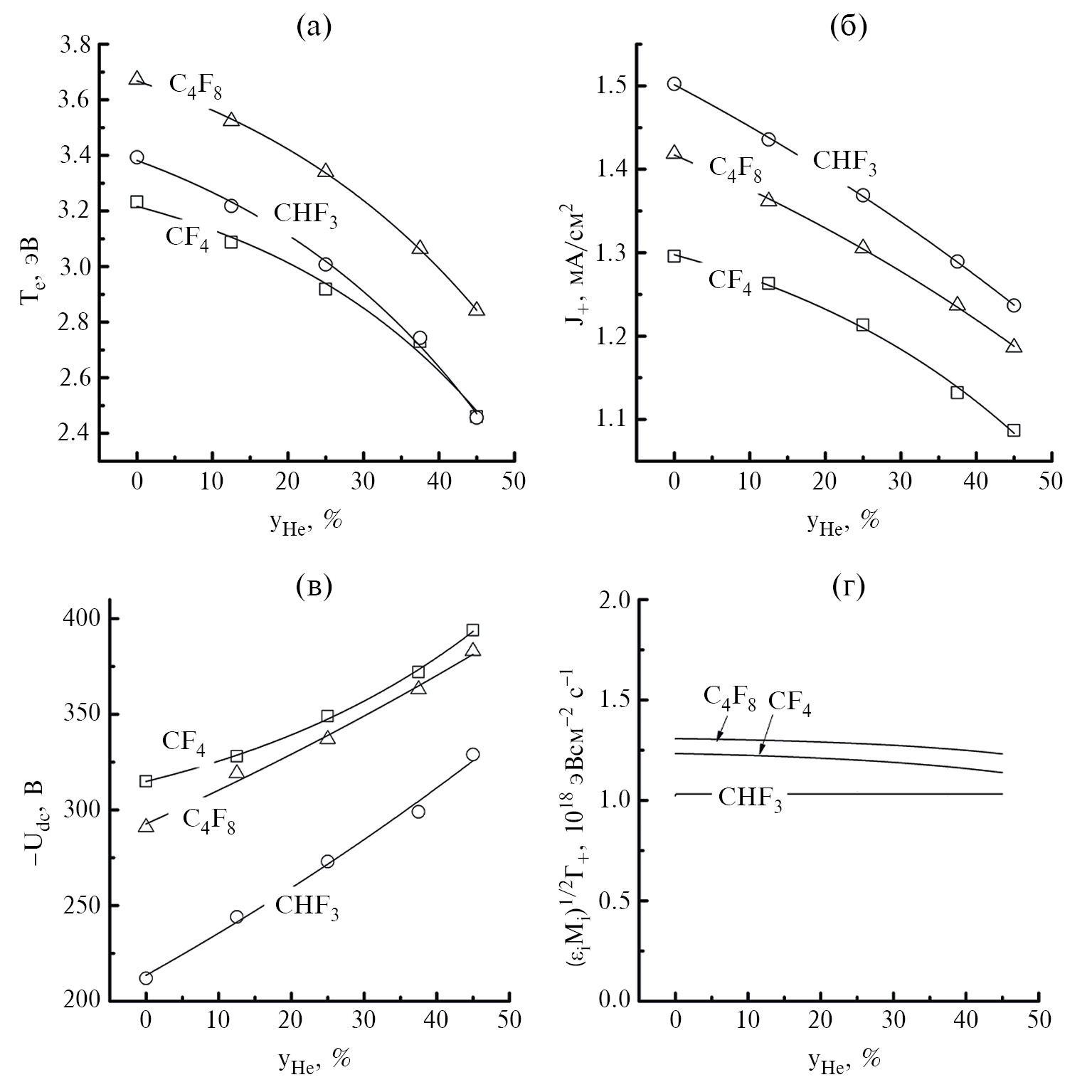 Рис. 1. Температура электронов (а), плотность ионного тока (б), отрицательное смещение на обрабатываемой поверхности (в) и параметр , отслеживающий изменение интенсивности ионной бомбардировки (г), в смесях CF4 + Ar/He, CHF3 + Ar/He и C4F8 + Ar/He в зависимости от содержания гелия в плазмообразующем газе.