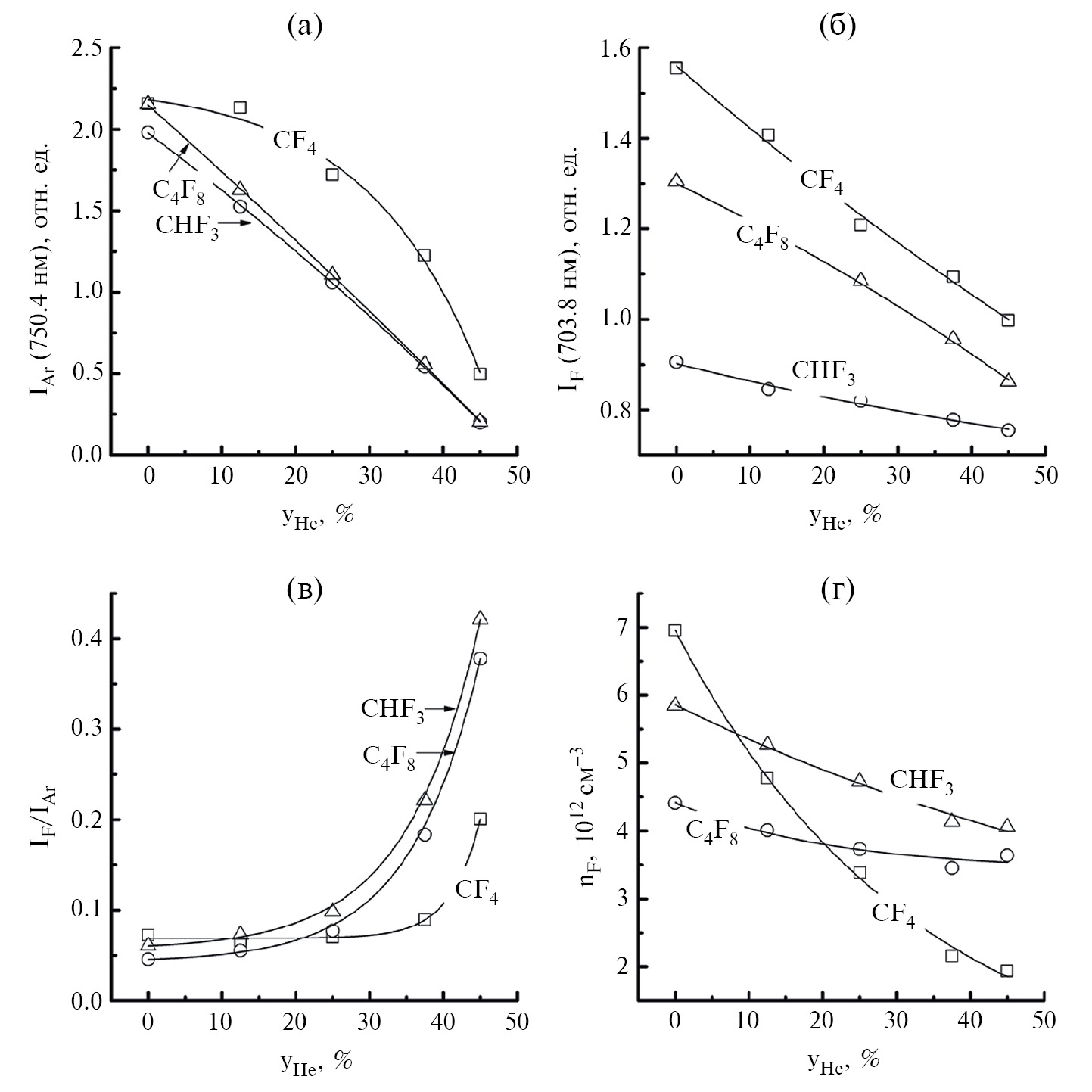 На рис. 2(а, б) показано влияние начального состава смесей на интенсивности излучения линий Ar 750.4 нм и F 703.8 нм. Очевидно, что характер зависимостей не отражает поведения концентраций соответствующих частиц по причине непостоянства параметров электронной компоненты плазмы. Отношения интенсивностей излучения (рис. 2(в)), а также результаты расчета абсолютных концентраций по ур. (1) (рис. 2(г)) позволяют заключить, что а) кинетика атомов фтора в смеси на основе CF4 заметно отличается от таковой в двух других смесях; и б) увеличение всегда вызывает снижение концентрации атомов фтора. По нашему мнению, резкая зависимость в плазме CF4 + Ar + He (в 3.6 раза при 0–48% He) отражает аналогичное изменение скорости образования атомов в реакциях R1 и R2, обусловленное одновременным снижением констант скоростей и концентрации электронов. Хотя аналогичный эффект характерен и для двух других смесей, его действие частично нивелируется изменением кинетики гибели атомов. Так, особенностью плазмы CHF3 является то, что константы скоростей реакций в группе R5 уменьшаются более чем на порядок величины в ряду CHF — CHF2 — CHF3 [30]. Поэтому снижение степени диссоциации исходных молекул с ростом сопровождается снижением и эффективной частоты гибели атомов. Можно предположить, что в смеси на основе C4F8 подобный эффект может быть связан с изменением частоты гибели атомов фтора в R7. Косвенным подтверждением этого могут служить результаты моделирования плазмы C4F8, показывающие уменьшение концентрации C2F4 при одновременном снижении температуры и концентрации электронов [31].
