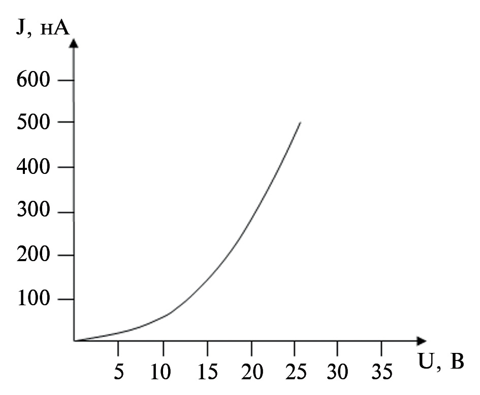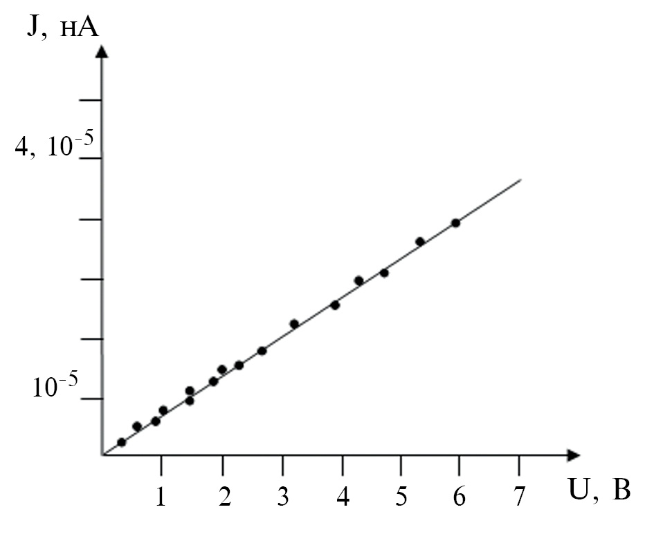 Подробно методика измерения с использованием платы, Lcad задействованная ранее в исследованиях статических электрических характеристик титановых наносужений описана в работе [5–7]. Однако ввиду того, что плата встроена в системный блок управляющего компьютера и имеет слабую систему подавления, находятся в пределах 10 мкА, которые как будет показано ниже, являются критическими для протекания через исследуемую структуру.