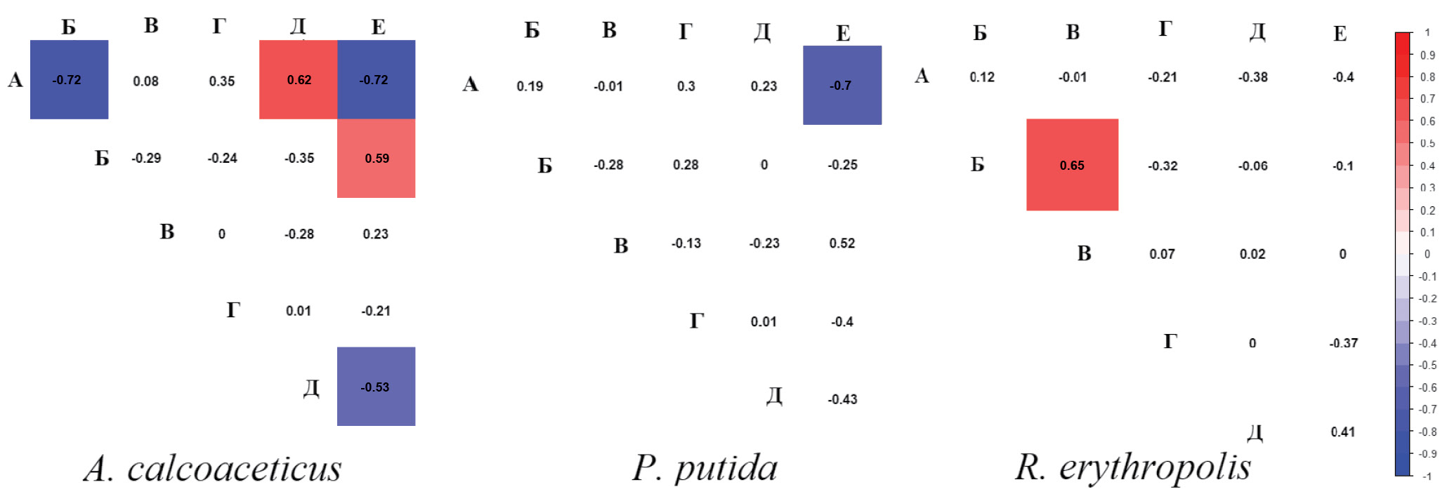 У A. calcoaceticus и P. putida была обнаружена значимая отрицательная корреляция между активностью СОД и уровнем ПОЛ. Вероятно, ПОЛ у исследуемых микроорганизмов активируется при пероксидном стрессе, когда индукция СОД не происходит. При этом у A. calcoaceticus, одновременно с усилением ПОЛ, активируется и каталаза (рис. 7). Исходя из полученных данных, уровень ПОЛ в большинстве случаев снижался со временем — от экспозиции 3 ч к экспозиции 6 ч, и, предположительно, каталаза являлась наиболее значимым ингибитором ПОЛ. О достаточно сложном взаимодействии и временнóй динамике работы различных компонентов антиоксидантной системы исследуемых бактерий свидетельствуют также обнаруженная отрицательная зависимость между активностью каталазы и СОД у A. calcoaceticus и положительная корреляция между активностью каталазы и содержанием глутатиона у R. erythropolis (рис. 7).