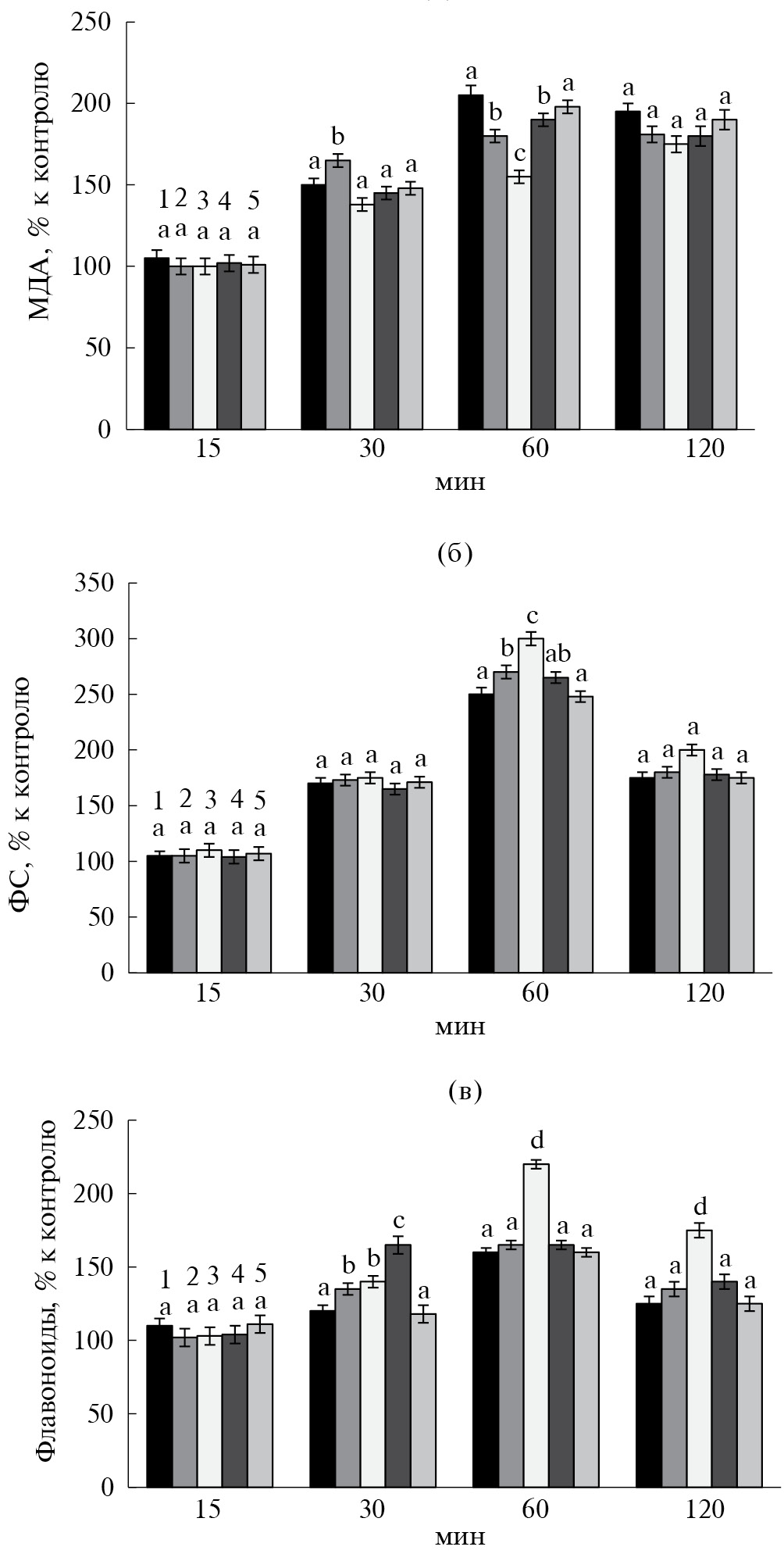 Рис. 1. Влияние лектина (2–5) A. brasilense Sp7 на содержание МДА (а), ФС (б) и флавоноидов (в) в корнях проростков пшеницы при засолении: 1 – контроль, без лектина; 2 – 0.1 мM; 3 – 0.3 мM; 4 – 0.6 мM; 5 – 1.2 мM. Результаты представлены как средние арифметические значения со стандартной ошибкой. Разными буквами обозначены достоверно отличающиеся величины (P < 0.05).
