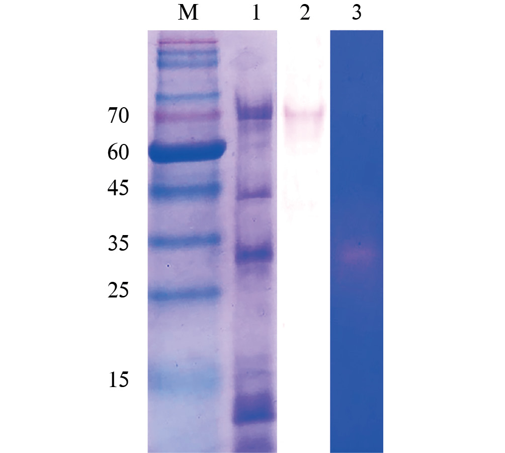 3. Fig. 2. Electrophoretic analysis of extracellular protease of A. tabacinus in PAGE with SDS-Na: M — markers; 1 — electrophoretogram according to Laemmli; 2 — staining for the presence of a carbohydrate component; 3 — casein zymogram.