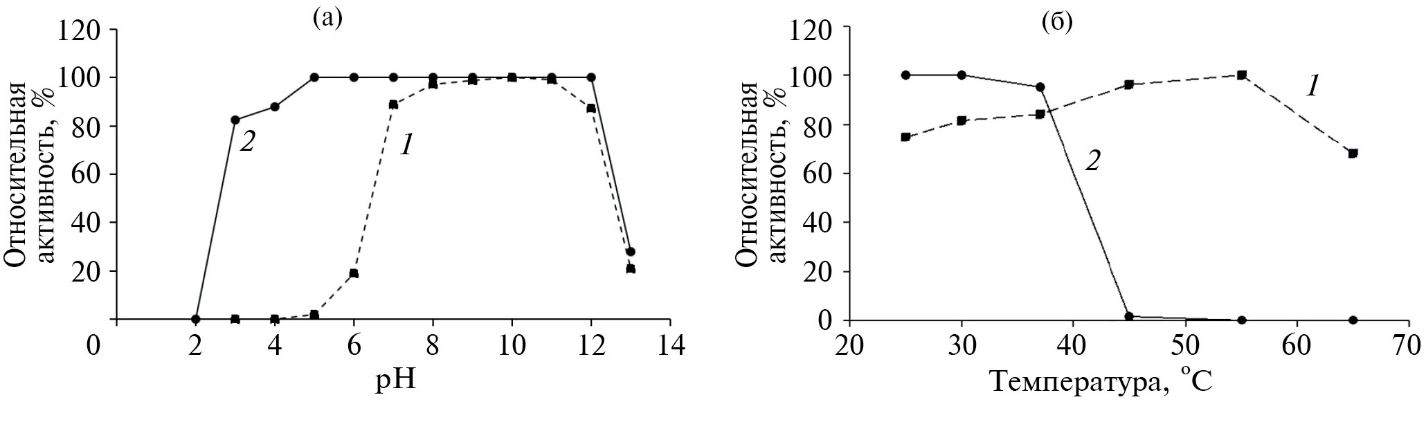 Определение оптимума активности фермента и его стабильности. Для исследования рН-оптимума использовали 0.4 М универсальный (натрий-ацетат-фосфат-боратный) буфер со значениями рН от 3.0 до 13.0. Определение активности по субстрату S-2366 проводили по методике, описанной выше, заменяя только буферный раствор в реакционной смеси. Для анализа стабильности проводили двухчасовую инкубацию фермента в объеме 200 мкл с 50 мкл 0.1 М универсального буфера в пределах pH от 2.0 до 13.0 при 25°C, после чего добавляли 100 мкл субстрата S-2366 в концентрации 0.5 мг/мл в 0.5 М Трис-HCl буфере, pH 8.2. Реакцию проводили в течение 5 минут и останавливали добавлением 200 мкл 50%-ной уксусной кислоты. Для определения температурного оптимума реакцию проводили при 25, 30, 37, 45, 55, 65°C. Для определения температурной стабильности проводили двухчасовую инкубацию фермента при указанных температурах, а затем проводили реакцию при 37°C по стандартной методике, описанной выше.