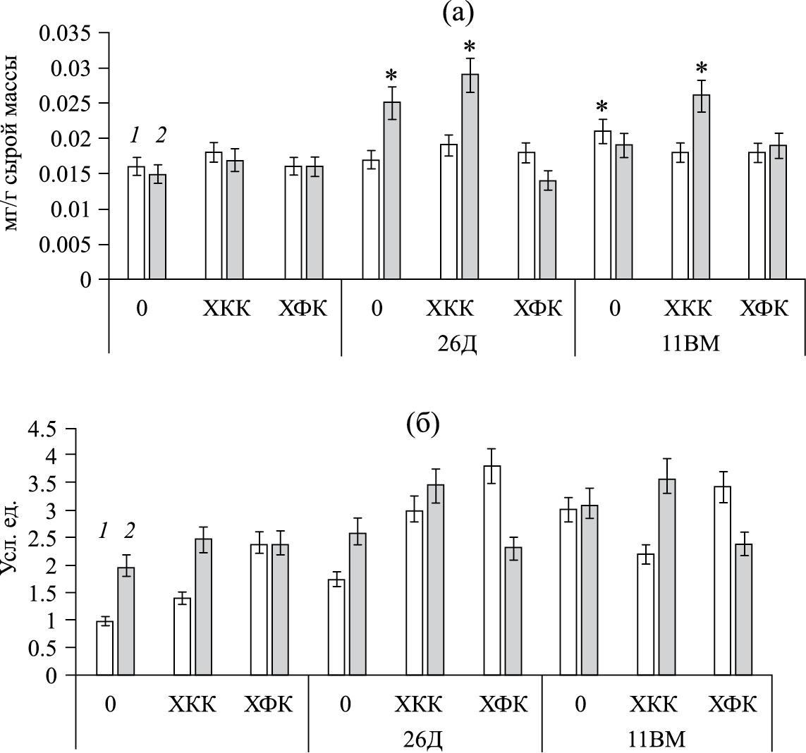 Рис. 2. Влияние конъюгатов ХКК и ХФК в композициях с B. subtilis 26Д и B. subtilis 11ВM на содержание пролина (а) и транскрипционную активность гена пирролин 5-карбоксилат синтазы (б) в растениях картофеля на 3 сутки после ино-куляции P. infestans: 1 — контроль, 2 — заражение P. infestans. Звездочкой отмечены значения, значимо отличающиеся от контрольных значений по критерию Краскела–Уоллиса.