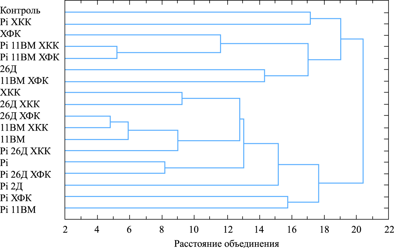 Как видно из табл. 2 и рис. 4, обработка ХФК в зараженных растениях существенно изменяла спектр белков листьев по сравнению с контролем. Различные варианты опыта формируют слабо выраженные кластеры, что свидетельствует о множественных механизмах регуляции синтеза защитных белков, вовлеченных в реакцию на обработку бактериями, конъюгатами хитозана и заражение P. infestans.