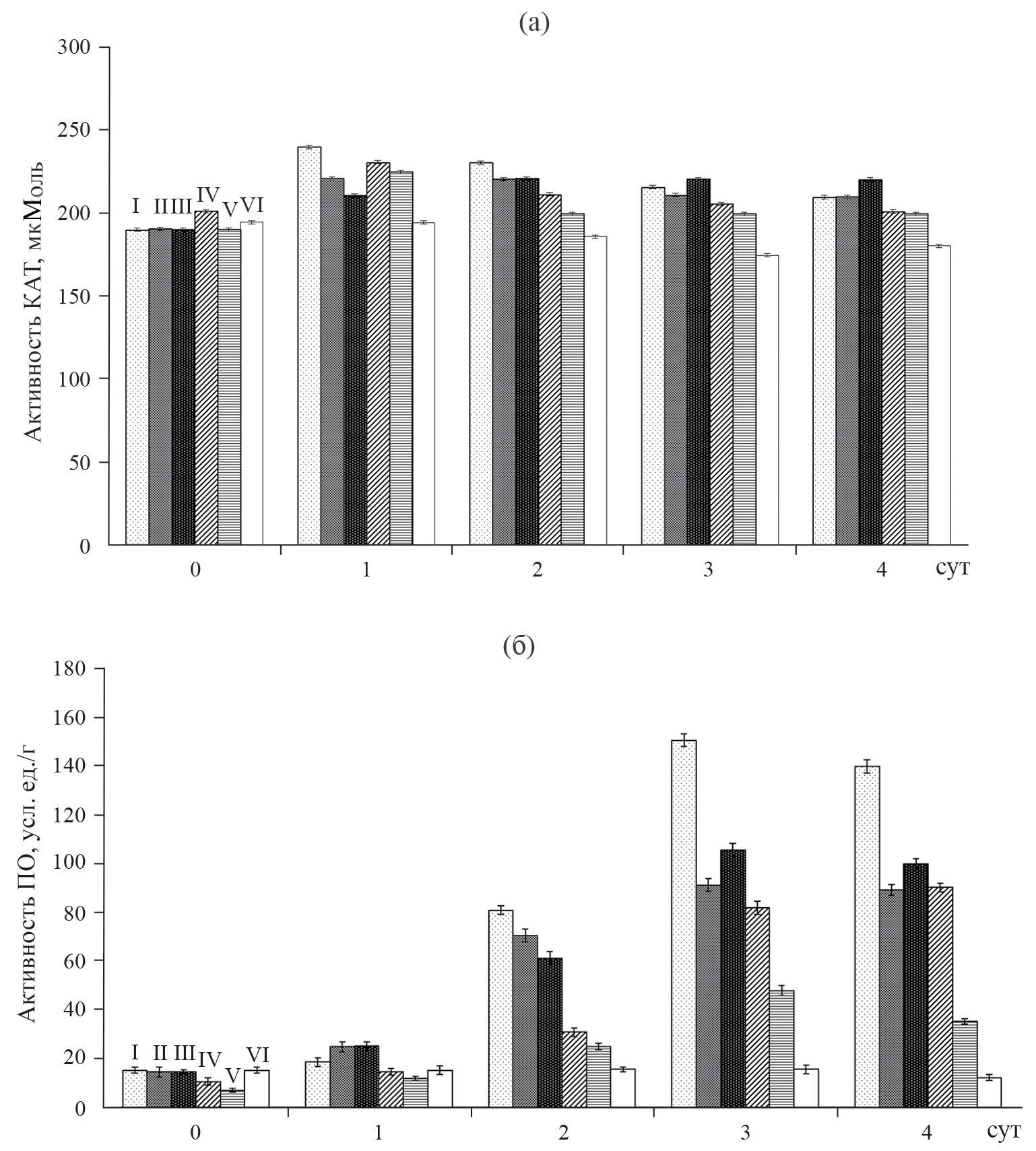 Рис. 2. Влияние заражения B. sorokiniana листьев пшеницы, обработанных штаммами B. subtilis и их сочетаниями с СХ, на активность КАТ (мкмоль Н2О2/мин/г сырой массы листьев) (а) и ПО (усл. ед./г сырой массы листьев) (б): I — контроль за-раженный; II — КЖ штаммов B. subtilis ВКМ В 2604D + ВКМ В 2605D; III — КЖ штаммов B. subtilis ВКМ В 2604D + ВКМ В 2605D + 0.1% СХ; IV — композиция: КЖ штаммов B. subtilis ВКМ В 2604D + ВКМ В 2605D + 0.1% СХ; V — 0.1% СХ; VI — незараженный контроль.