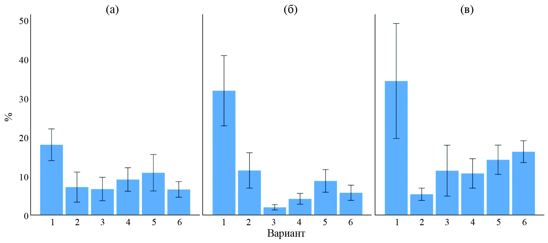 Рис. 6. Интенсивность развития мучнистой росы (%) пшеницы при использовании бактериальных штаммов B. subtilis (2, 6) и полифункциональных комплексов с 0.1% СХ (4, 5), 2022 г: 1 — контроль (вода); 2 — B. subtilis ВКМ В 2604D + ВКМ В 2605D; 3 — Витаплан, СП; 4 — B. subtilis ВКМ В 2604D + ВКМ В 2605D + 0.1% CХ; 5 — B. subtilis И 5 + 0.1% СХ; 6 — B. subtilis И 5 (а, б, в — повторности опыта).