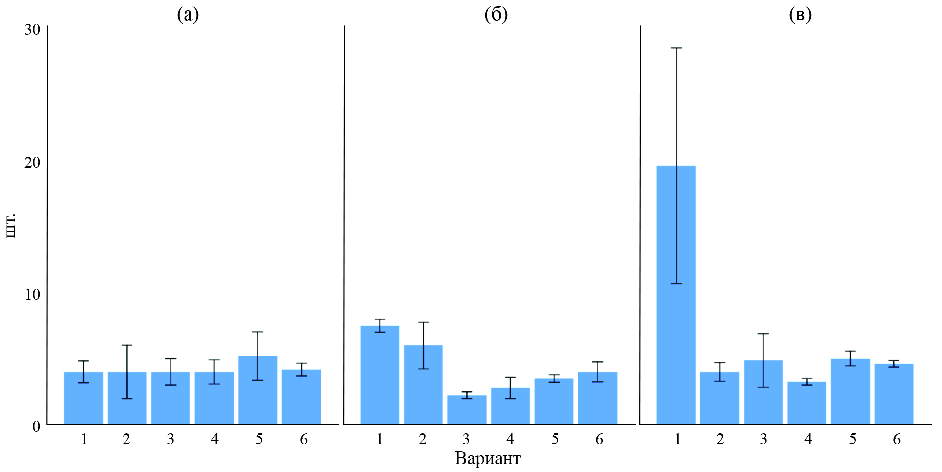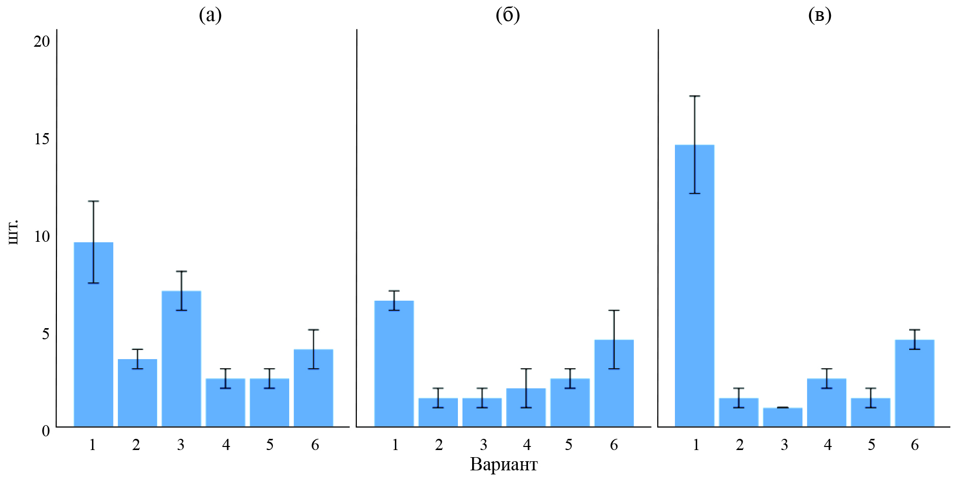 Рис. 3. Число полос с пустулами желтой ржавчины пшеницы при использовании бактериальных штаммов B. subtilis (2, 6) и полифункциональных комплексов с 0.1% СХ (4, 5), 2022 г.: 1 — контроль (вода); 2 — B. subtilis ВКМ В 2604D + ВКМ В 2605D; 3 — Витаплан, СП; 4 — B. subtilis ВКМ В 2604D + ВКМ В 2605D + 0.1% CХ; 5 — B. subtilis И 5 + 0.1% СХ; 6 — B. subtilis И 5 (а, б, в — повторности опыта).