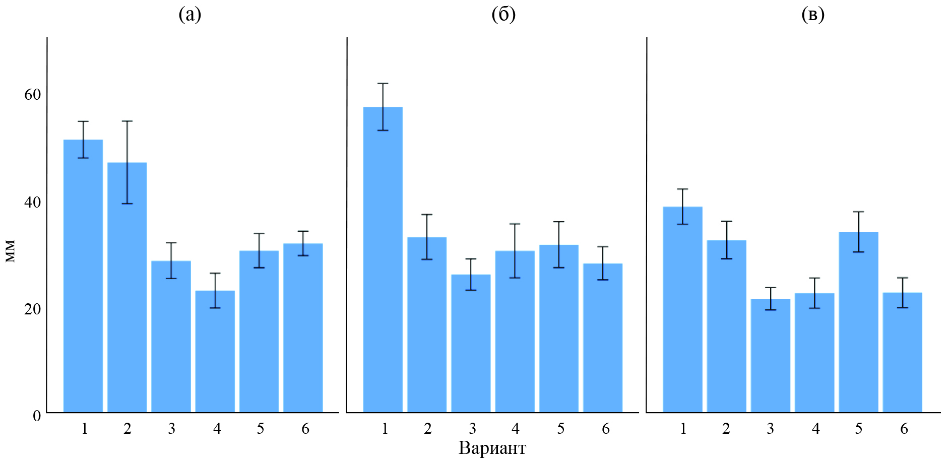 Рис. 4. Длина полосы с пустулами желтой ржавчины пшеницы при использовании бактериальных штаммов B. subtilis (2, 6) и полифункциональных комплексов с 0.1% СХ (4, 5), 2022 г.: 1 — контроль (вода); 2 — B. subtilis ВКМ В 2604D + ВКМ В 2605D; 3 — Витаплан, СП; 4 — B. subtilis ВКМ В 2604D + ВКМ В 2605D + 0.1% CХ; 5 — B. subtilis И 5 + 0.1% СХ; 6 — B. subtilis И 5 (а, б, в — повторности опыта).