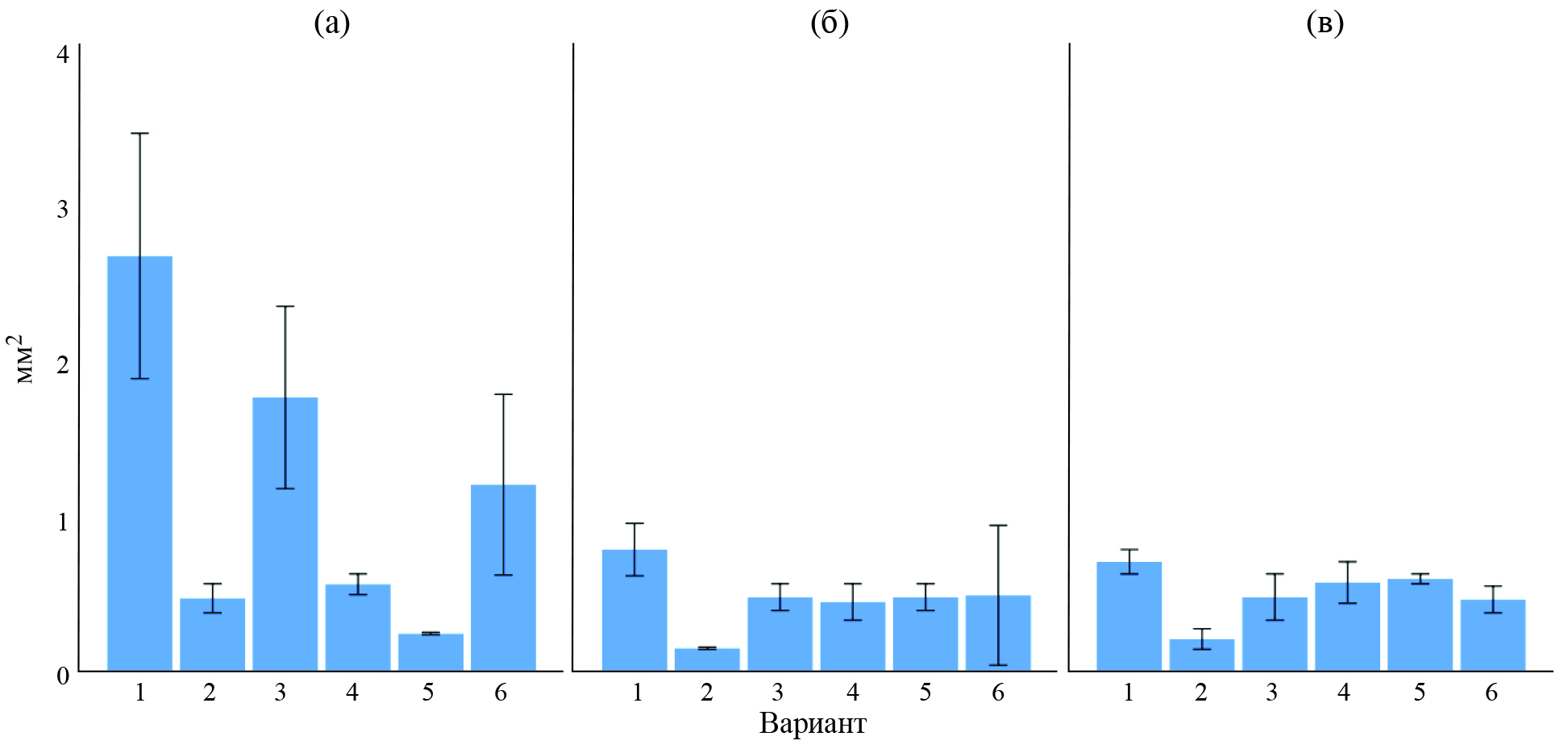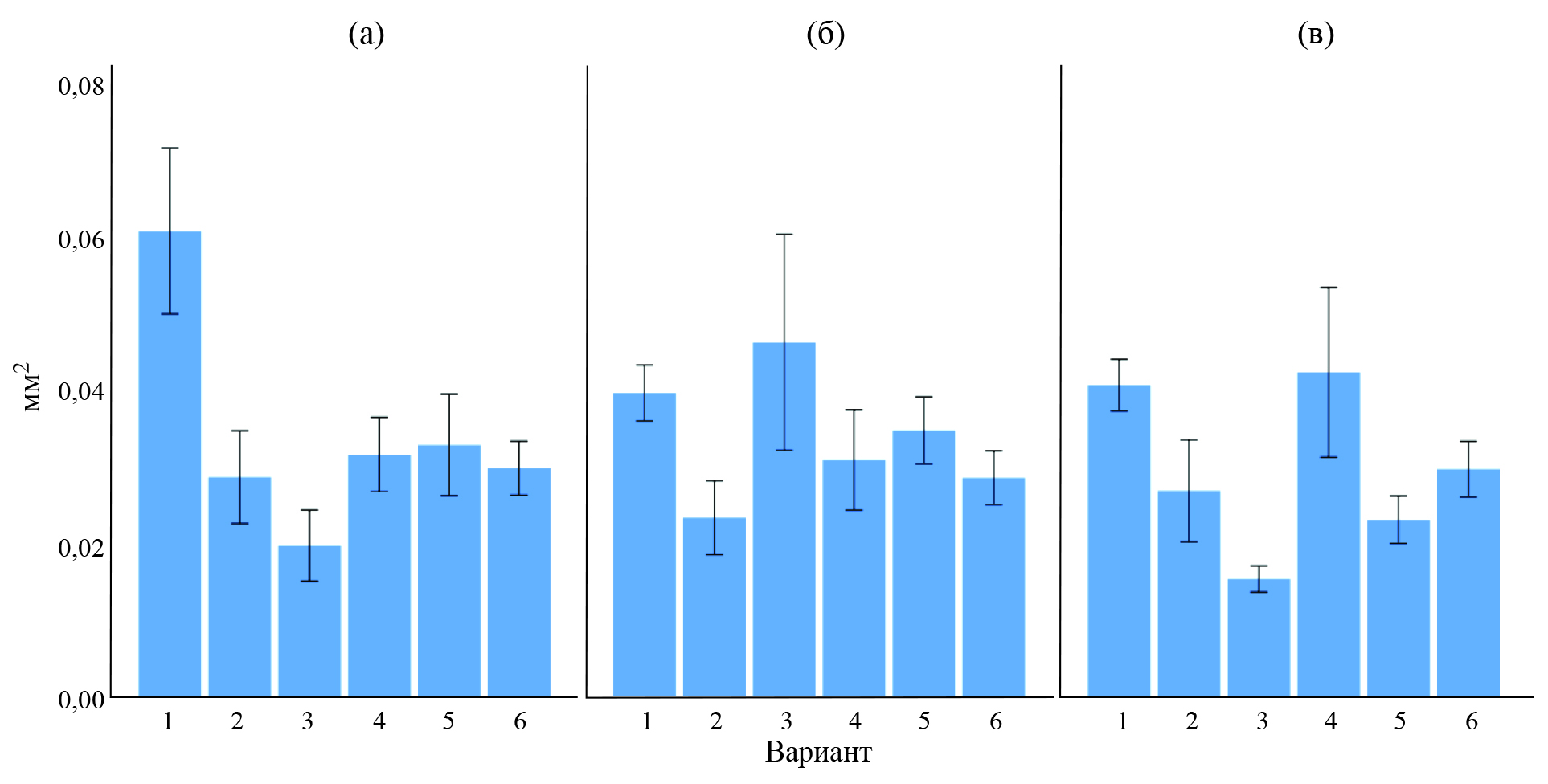 Рис. 5. Площадь пустулы желтой ржавчины пшеницы при использовании бактериальных штаммов B. subtilis (2, 6) и полифункциональных комплексов с 01% СХ (4, 5), 2022 г.: 1 — контроль (вода); 2 — B. subtilis ВКМ В 2604D + ВКМ В 2605D; 3 — Витаплан, СП; 4 — B. subtilis ВКМ В 2604D + ВКМ В 2605D + 0.1% CХ; 5 — B. subtilis И 5 + 0.1% СХ; 6 — B. subtilis И 5 (а, б, в — повторности опыта).