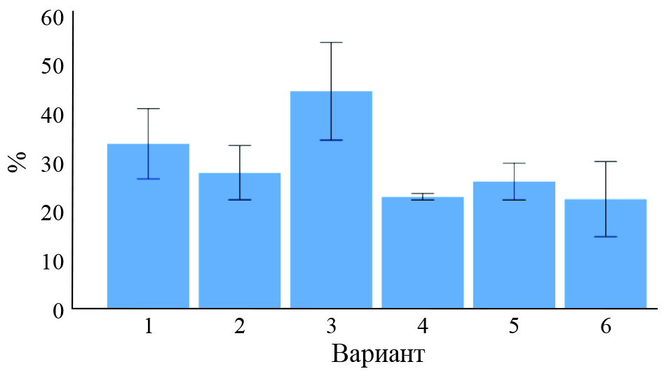 Определено существенно снижение развития мучнистой росы во всех вариантах опыта при применении бактериальных штаммов и полифункциональных комплексов (рис. 6). Биологическая эффективность полифункциональных комплексов B. subtilis ВКМ В‑2604D + ВКМ В‑2605D + 0.1% CХ и B. subtilis И‑5 + 0.1% СХ в отношении болезни составила 92,8%, а развитие болезни снизилось на 12.8%.