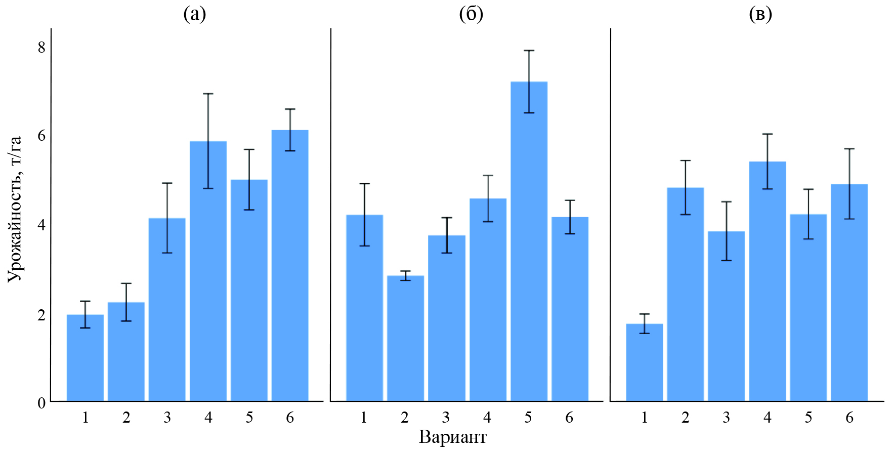Рис. 11. Урожайность пшеницы (т/га) при использовании бактериальных штаммов B. subtilis (2, 6) и полифункциональных комплексов с 0.1% СХ (4, 5), 2022 г.: 1 — контроль (вода); 2 — B. subtilis ВКМ В 2604D + ВКМ В 2605D; 3 — Витаплан, СП; 4 — B. subtilis ВКМ В 2604D + ВКМ В 2605D + 0.1% CХ; 5 — B. subtilis И 5 + 0.1% СХ; 6 — B. subtilis И 5 (а, б, в — повторности опыта).