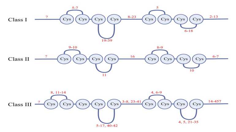 Структурное разнообразие гидрофобинов. Гидрофобины – белки с относительно небольшой молекулярной массой (5–20 кДа), имеющие в своей структуре от 50 до 200 аминокислот в зависимости от конкретного белка [4]. На основании физико-химических и структурных особенностей выделяют 2 класса гидрофобинов [5]. Для обоих классов характерно наличие консервативных участков в аминокислотной последовательности (~18% для класса I и ~37% для класса II) [6]. Разделение на два класса основывается на распределении цистеинов и кластеризации гидрофильных и гидрофобных остатков: гидрофобины I класса характеризуются наличием 8 цистеинов, которые образуют 4 дисульфидные связи [7]. Гидрофобины I класса подразделяют на два подкласса: класс IA, гены которого обнаружены у аскомицетовых грибов, и класс IB, выделяемые только из базидиальных грибов [8]. Некоторые гидрофобины, секретируемые грибами видов Aspergillus, выделяют в отдельный класс III за счет отличного положения дисульфидных связей и наличия дополнительных цистеинов в первичной структуре. Для Trichoderma описаны гидрофобины неизвестного класса и псевдокласс I [9]. На рисунке 1 представлено схематичное изображение гидрофобинов I, II и III классов с описанием положения дисульфидных связей.