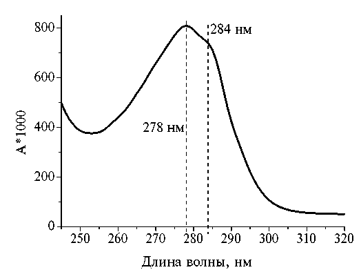 Синтез и характеристика конъюгата гаптен-белок. Конъюгирование НФ с СИТ проводили с помощью реакции Манниха в молярном соотношении 30 : 1. В ходе реакции углерод формальдегида формирует метиленовую группировку, встраиваемую в орто-положение по отношению к фенольному гидроксилу. Эта группа в конъюгате является связующим звеном между аминогруппой белка и НФ. Полученный конъюгат охарактеризован методом спектрофотометрии (рис. 2). Максимум поглощения нативного нонилфенола находится при 278 нм, формируя характерное “плечо” белкового пика в спектре конъюгата гаптен-белок. Вычисленная концентрация конъюгата по белку составила 7.4 мг/мл.