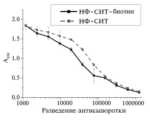 Биотинилирование конъюгата гаптен-белок. Конъюгат НФ-СИТ смешивали с N-сукцинимидным эфиром биотинамидогексаноил-6-аминогексановой кислоты в мольном соотношении 1: 20 и инкубировали 2 ч при комнатной температуре и перемешивании. Продукт реакции диализовали против 50 мМ фосфатного буфера (ФБС, pH 7.4) с использованием центрифужных фильтров Amicon Ultracel 10 K (Millipore, США).