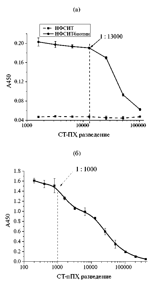 Выбор условий проведения ИФА с использованием МЧ. Для осуществления предложенной схемы ИФА с магнитным концентрированием было проведено биотинилирование полученного конъюгата НФ-СИТ с проверкой сохранения иммунохимической активности. Поскольку конъюгат НФ-СИТ-биотин бифункционален и должен взаимодействовать как с иммуноглобулинами в составе антисыворотки, так и со стрептавидином, то проверка заключалась в тестировании данных взаимодействий. Для этого в лунки микропланшета с иммобилизованными конъюгатами НФ-СИТ и НФ-СИТ-биотин (3 мкг/мл) вносили антисыворотку в разведениях от 1 : 1000 до 1 : 1000000, а затем – антивидовые антитела, меченные пероксидазой хрена, и регистрировали оптический сигнал, генерируемый ферментной меткой в составе иммунных комплексов. Согласно полученным данным, препарат НФ-СИТ до и после биотинилирования функционально активен (рис. 4). Аналогично оценивали реакционную способность биотина, используя конъюгат стрептавидин-пероксидаза хрена (СТ-ПХ). Как видно из рис. 6А, связывание с биотинилированным конъюгатом наблюдается при различных разведениях препарата СТ-ПХ, однако оптическая плотность невысока. Поэтому для увеличения сигнала использовали альтернативный препарат стрептавидина, меченного полипероксидазой (СТ-пПХ). Замена на препарат с увеличенным числом ферментных меток позволила увеличить значение оптической плотности в 9 раз, сохраняя низкий уровень неспецифического сигнала (рис. 5б). Таким образом, мы подтвердили реакционную способность конъюгата НФ-СИТ-биотин, а также выбрали необходимые разведения реагентов – 1 : 1000 для СТ-пПХ и 1 : 13000 для СТ-ПХ (рис. 5).